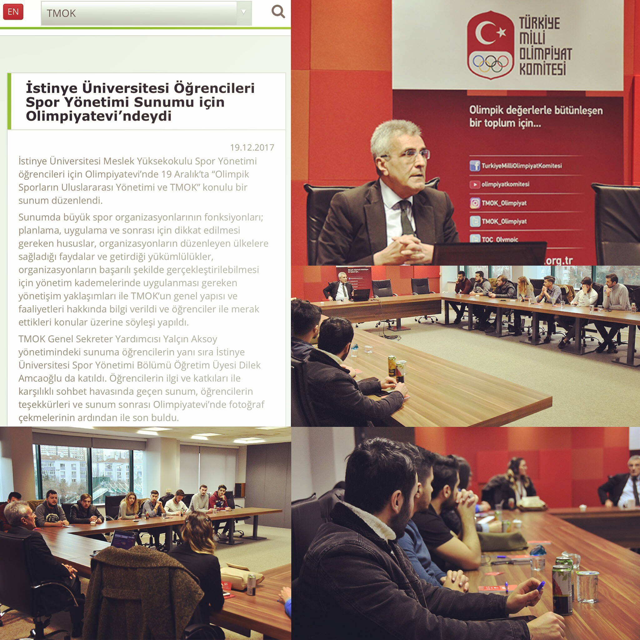 Spor Yönetimi Programı öğrencilerinin Türkiye Milli Olimpiyat Komitesi Olimpiyat Evine gerçekleştirdiği ziyaret kapsamında “Olimpik Sporların Uluslararası Yönetimi ve TMOK” konulu sunuma ve müze gezisine katılım sağlanmıştır.