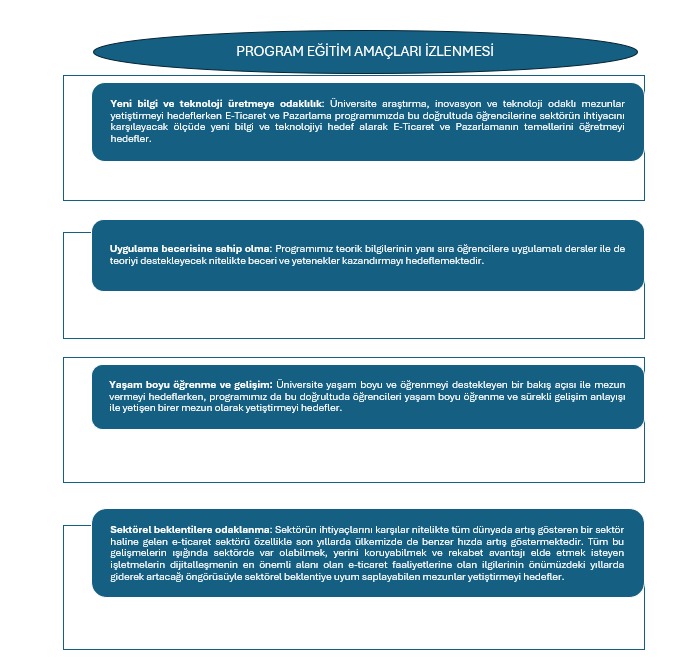 • Sektörel beklentilere odaklanma: Sektörün ihtiyaçlarını karşılar nitelikte tüm dünyada artış gösteren bir sektör haline gelen e-ticaret sektörü özellikle son yıllarda ülkemizde de benzer hızda artış göstermektedir. Tüm bu gelişmelerin ışığında sektörde var olabilmek, yerini koruyabilmek ve rekabet avantajı elde etmek isteyen işletmelerin dijitalleşmenin en önemli alanı olan e-ticaret faaliyetlerine olan ilgilerinin önümüzdeki yıllarda giderek artacağı öngörüsüyle sektörel beklentiye uyum saplayabilen mezunlar yetiştirmeyi hedefler.