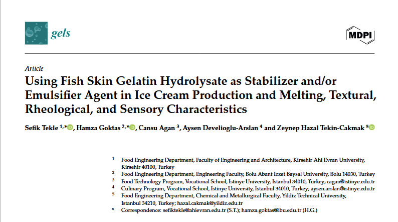 Meslek Yüksekokulu Gıda Teknolojisi Program Başkanı Öğr. Gör. Cansu AĞAN SARIÇİÇEK’in “Using Fish Skin Gelatin Hydrolysate as Stabilizer and/or Emulsifier Agent in Ice Cream Production and Investigation of Melting, Textural, Rheological, and Sensory Characteristics” başlıklı makalesi, Q1 kategorisindeki Gels (MDPI) dergisinde yayımlandı.