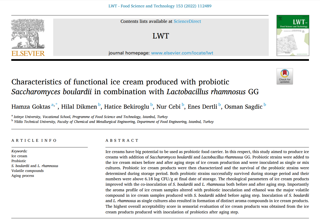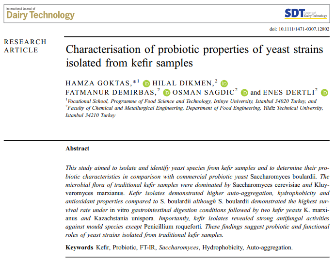 Gıda Teknolojisi Programı Hocalarımızdan Öğretim Görevlisi Dr. Hamza GÖKTAŞ'ın Uluslararası İndesklerde taranan SCI-Expanded Q3 dergi olan International Journal Dairy Technology de "Characterisation of Probiotic Properties of Yeast Strains Isolated From Kefir Samples" adlı makalesi yayımlanmıştır.