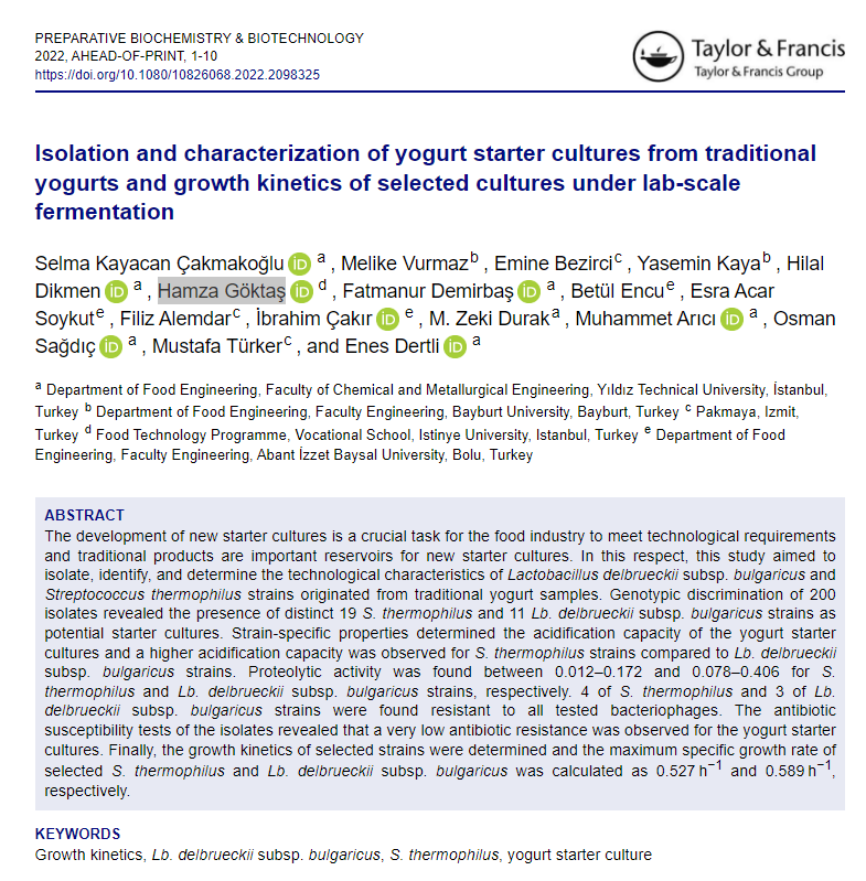 Meslek Yüksekokulu Gıda Teknolojisi Program Başkanı Dr. Öğr. Üyesi Hamza GÖKTAŞ'ın Uluslararası SCI ve SCI-E indekslerinde taranan Preparative Biochemistry & Biotechnology (Q3) dergisinde, "Isolation and Characterization of Yogurt Starter Cultures from Traditional Yogurts and Growth Kinetics of Selected Cultures under Lab-scale" başlıklı makalesi yayınlanmıştır. İlgili çalışma TÜBİTAK (KAMAG 1007 Projesi) tarafından desteklenen bir çalışma olup, ilgili makalede geleneksel yoğurt örneklerinden yoğurt fermentasyonunu başlatıcı mikroorganizmalar olan Lb. bulgaricus ve St. thermophilus suşları izole edilerek ülkemizde yoğurt endüstrisinde kullanılabilecek starter kültür adayları elde edilmiştir. Hocamızı kutlar, başarılarının devamını dileriz.