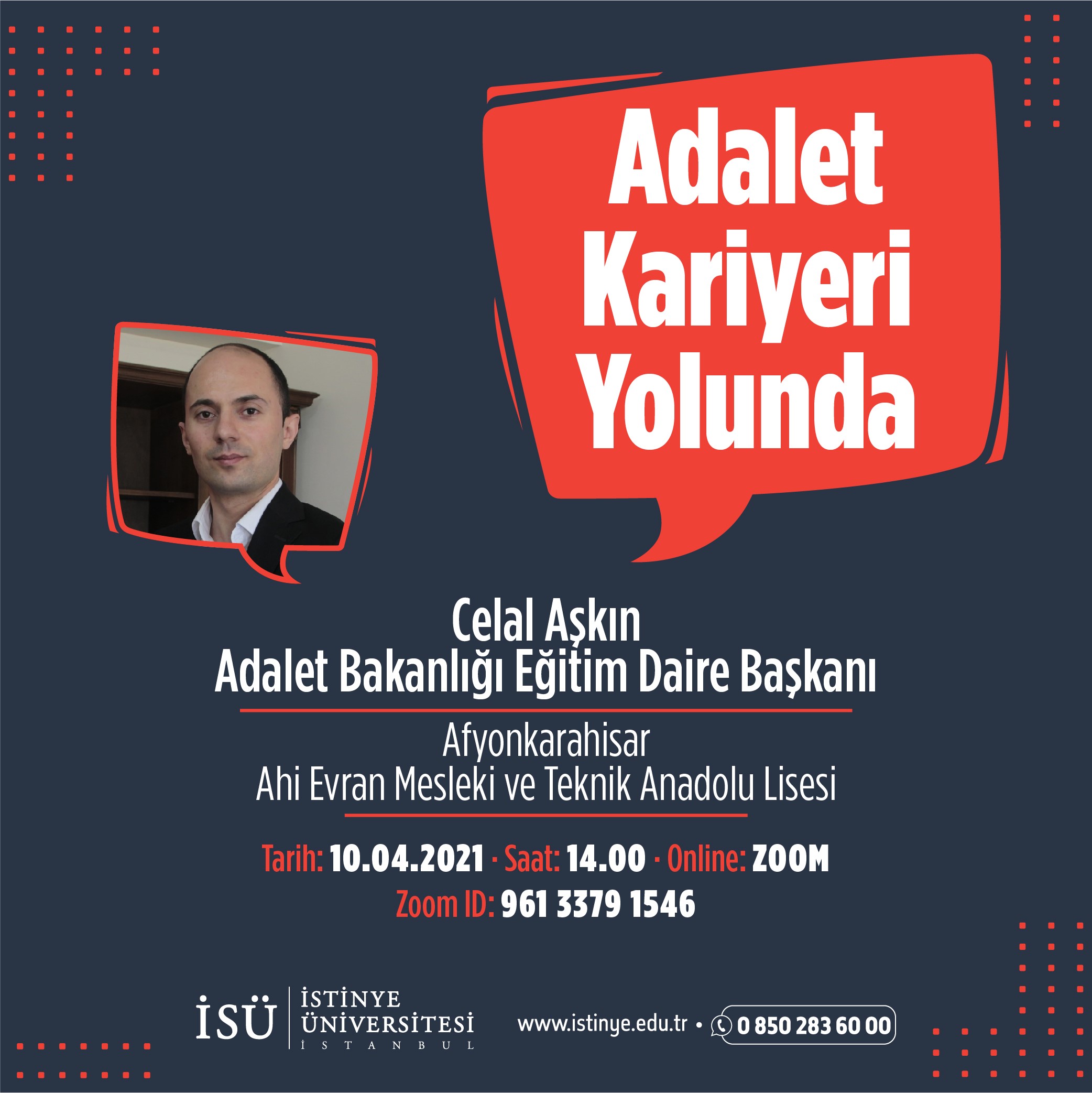 Adalet Meslek Yüksek Okulu mezunu olan Sayın AŞKIN, meslek hayatına zabıt katipliği ile başlamış, müteakiben girdiği sınav sonucu İcra Müdürlüğüne yükselmiştir. Görevlerinde gösterdiği başarı neticesinde Adalet Bakanlığı Eğitim Dairesi Şube Müdürlüğü görevine getirilen Sayın Aşkın halen bu görevi yürütmektedir. Klavye kullanma yarışmalarında dünya şampiyonlukları bulunan Sayın Celal Aşkın öğrencilere kariyer gelişimi ve klavye kullanımı ile ilgili soru-cevap yöntemi ile çok yararlı bilgiler aktarmıştır. Sayın Celal Aşkın'a etkinlikte sağladığı katkı nedeniyle teşekkür ederiz.