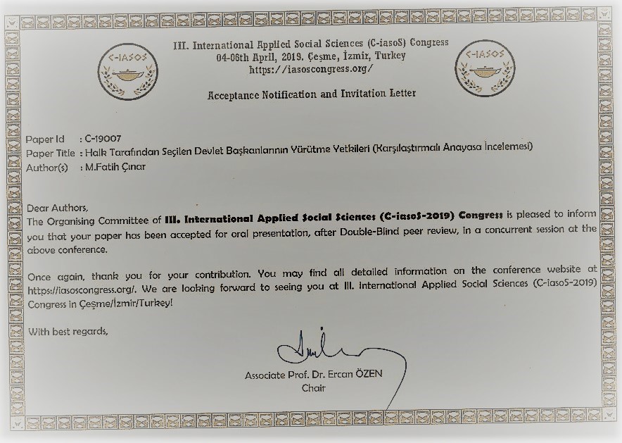 MYO Adalet Program Başkanı Dr.M.Fatih ÇINAR Halk Tarafından Seçilen Devlet Başkanlarının Yürütme Yetkileri (Karşılaştırmalı Anayasa İncelemesi) / Executive Powers of the Presidents Elected by the Public (Comparative Constitutional Review) başlıklı bildirisiyle İzmir'de 04-06 Nisan 2019 tarihleri arasında yapılan Uygulamalı Sosyal Bilimler Kongresi Applied Social Sciences Congress (C-IASOS – 2019) katılmıştır. Bildiri özetle: Halk tarafından seçilen devlet başkanlığı modelleri uygulayan ABD, Fransa ve Rusya örneklerinin anayasayalarında yürütme yetkileri incelenmekte ve Türkiye'nin 2017 halk oylaması ile geçtiği yeni sistem ile karşılaştırma yapılmaktadır. Halk tarafından seçilen devlet başkanlığı sistemlerinin olumlu ve olumsuz yönleri ortaya koyulduktan sonra Türkiye için anayasal öneri noktaları vurgulanmaktadır.