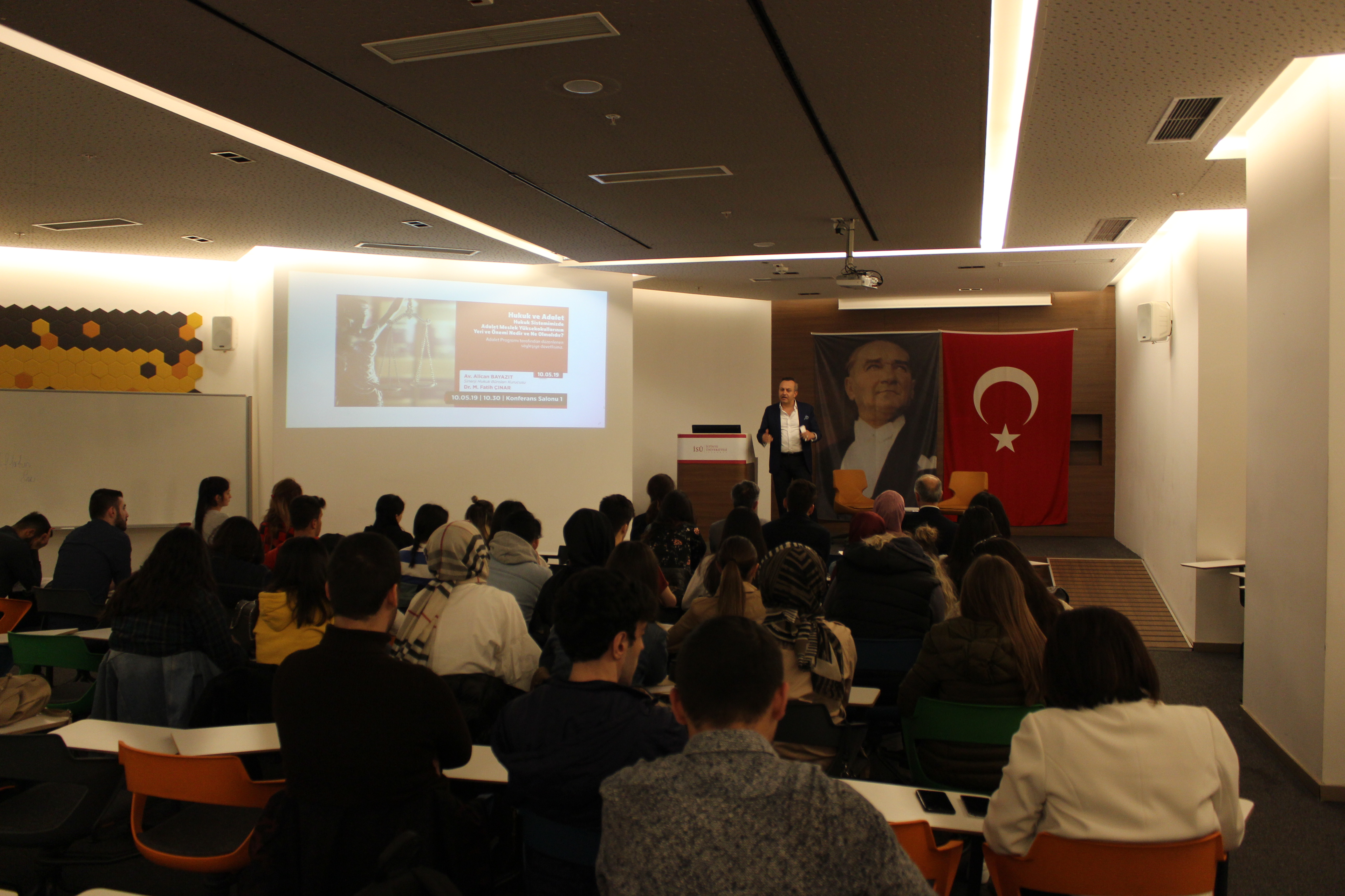 Konuşmasında, Türkiye’nin en büyük hukuk operasyonunu yapan bürolardan biri olduklarını 100’ün üzerinde Avukat ve Büro Elemanı çalışanı ile birlikte bu faaliyetleri yürüttüklerini, Adalet Bölümü mezunları ile daha verimli çalışmalar yapabileceklerini düşündüğünü söylemiştir. Ayrıca hayatı boyunca bir hukukçu ve avukat olarak karşılaştığı ilginç olaylardan örnekler vermiş, son bölümde öğrencilerin sorularını cevaplamıştır. İSÜ MYO Md. Prof.Dr. İlhan TOMANBAY tarafından kendisine teşekkür sertifikası sunulmuştur.