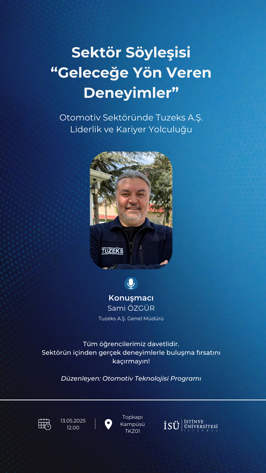 İstinye Üniversitesi Meslek Yüksekokulu Otomotiv Teknolojisi Programı, 13 Mayıs 2025 tarihinde önemli bir ismi ağırladı. Tuzeks A.Ş. Genel Müdürü Sayın Sami Özgür, öğrencilerle bir araya gelerek sektör deneyimlerini ve kariyer yolculuğunu paylaştı.