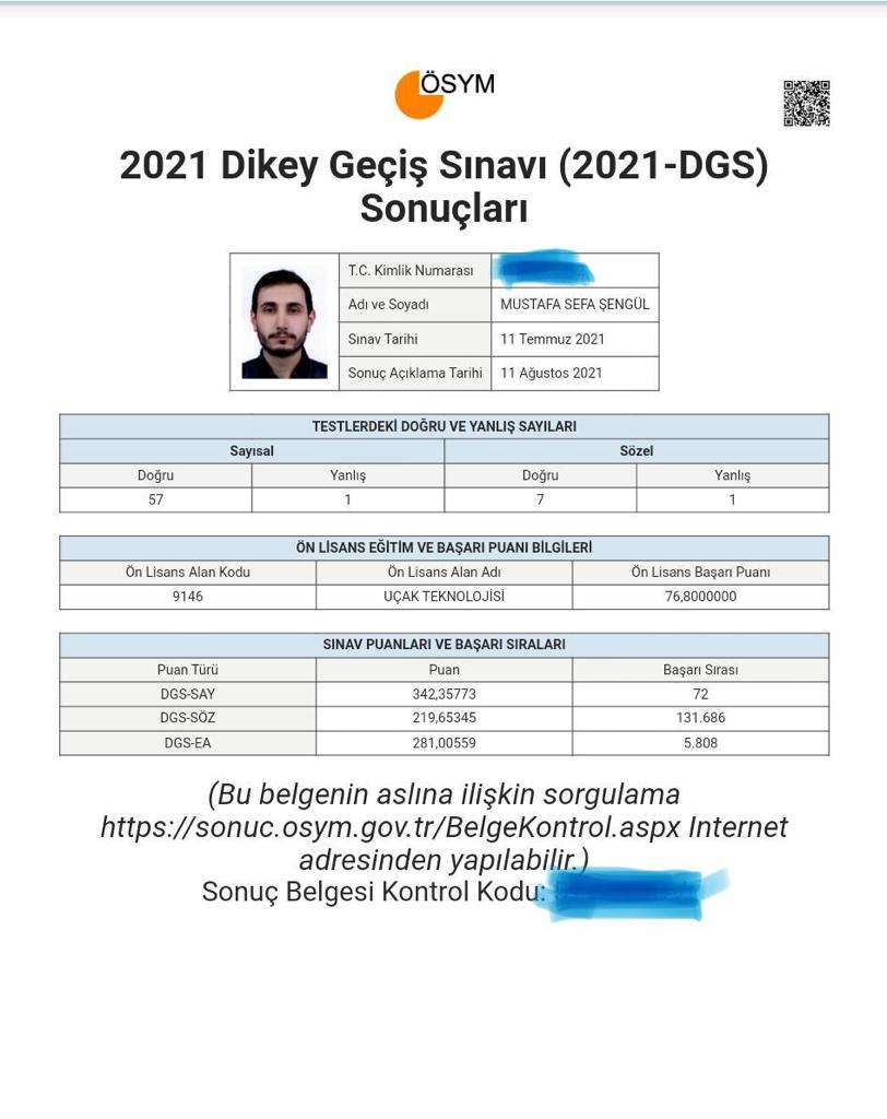 İstinye Üniversitesi Meslek Yüksekokulu Uçak Teknolojisi Programı mezunu Mustafa Şengül, 290000 kişinin katıldığı Dikey Geçiş Sınavında, Sayısal alanda Türkiye 72.'si oldu.