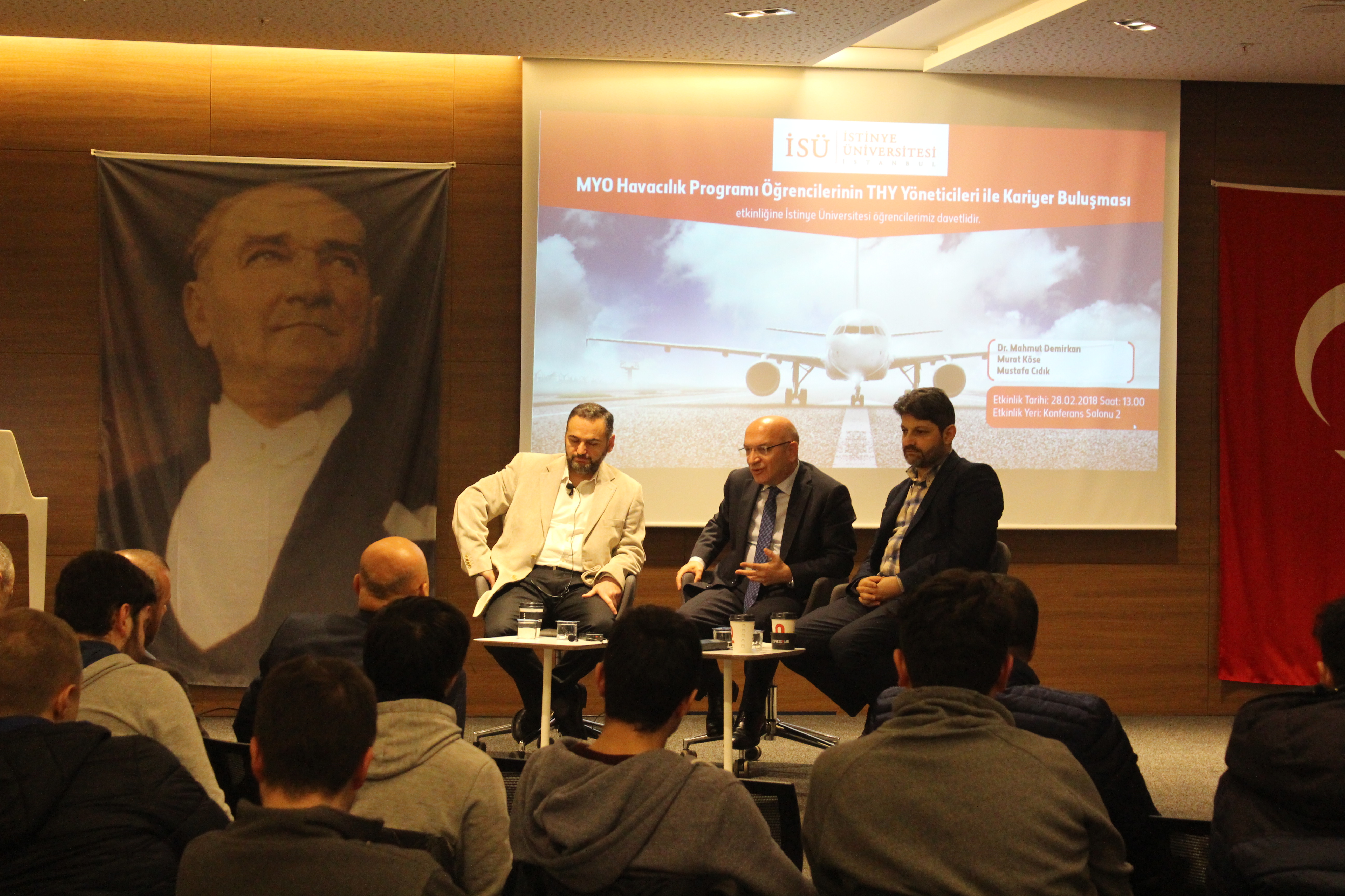Öğr.Gör. Serdar ALBAYRAK koordinatörlüğünde, Uçak Teknolojisi Programı tarafından MYO Havacılık Programı Öğrencilerinin THY Yöneticileri ile Kariyer Buluşması Başlıklı Konferans gerçekleştirildi. Türk Hava Yolları Teknik A.Ş Eğitim Daire Başkanı Mahmut DEMİRKAN, EASA 147 Temel Eğitim Müdürü Mustafa CIDIK, TİP Eğitim Müdürü Murat KÖSE Havacılık Sektöründeki son gelişmeler ile ilgili sunumlarını gerçekleştirdiler.