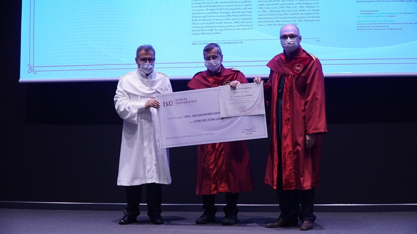 İstinye Üniversitesi Kongre Merkezinde gerçekleştirilen 2020-2021 Akademik Açılış ve Onurlandırma Töreni’nde Sağlık Bilimleri Fakültesi Beslenme ve Diyetetik Bölümü öğretim görevlisi Prof. Dr. Hamit Köksel'e mineral, lif bakımından zenginleştirilmiş tahıllar, tahıl genotipleri ve besin değerleri karşılaştırılması üzerine yapmış olduğu yayın ve projelerindeki başarılarından dolayı sertifika ve teşvik ödülü takdim edilmiştir.