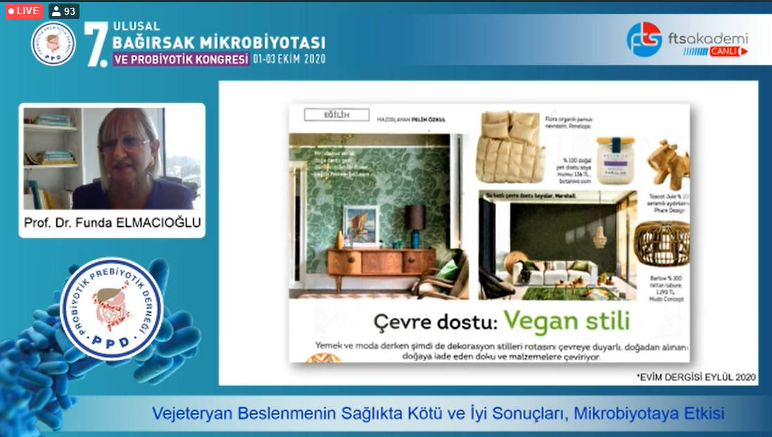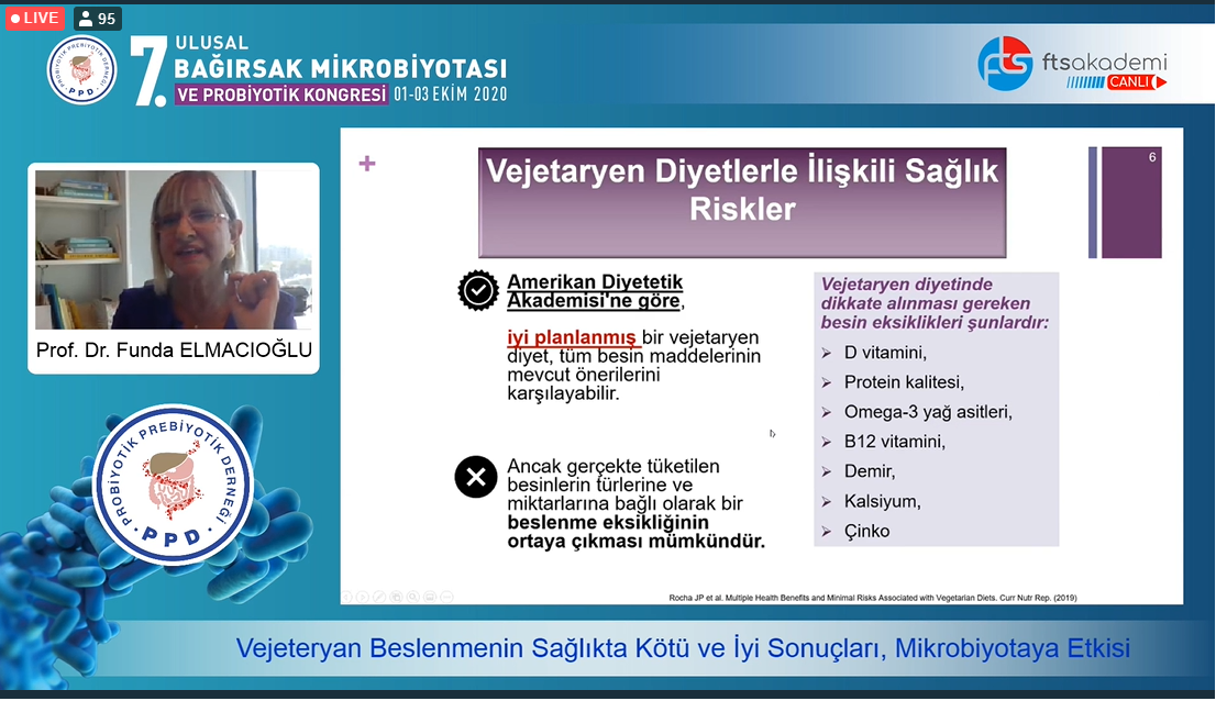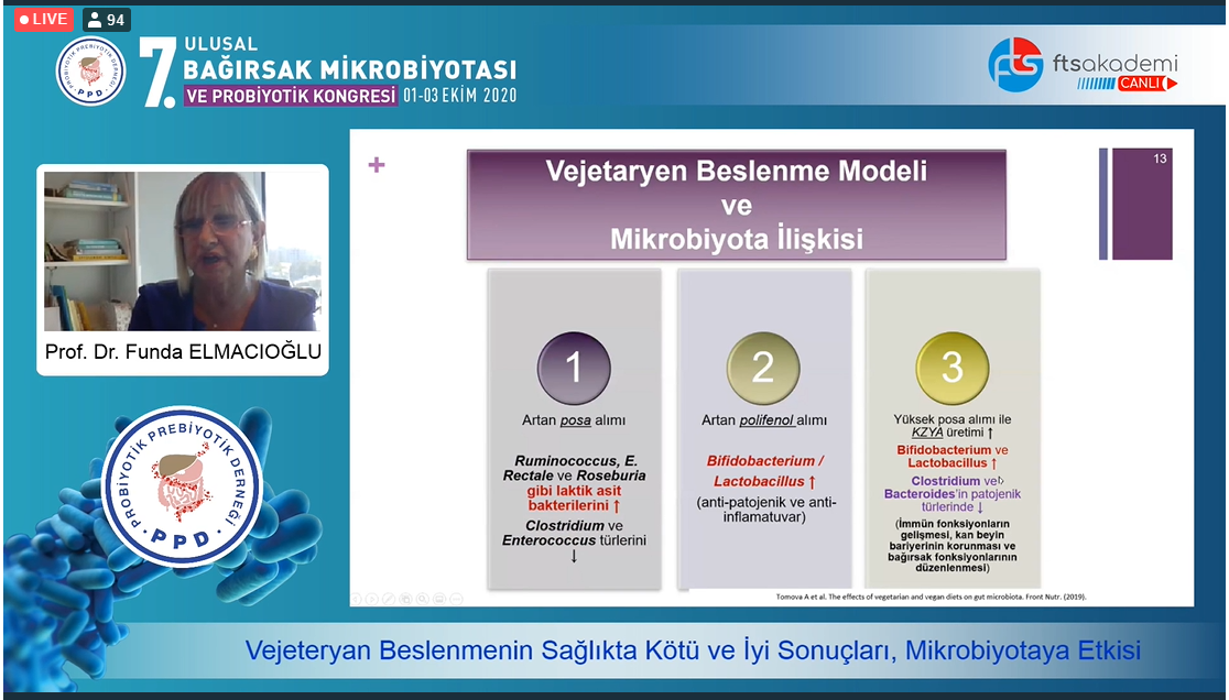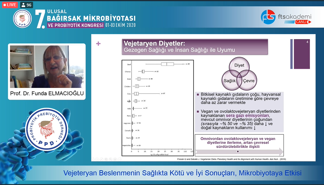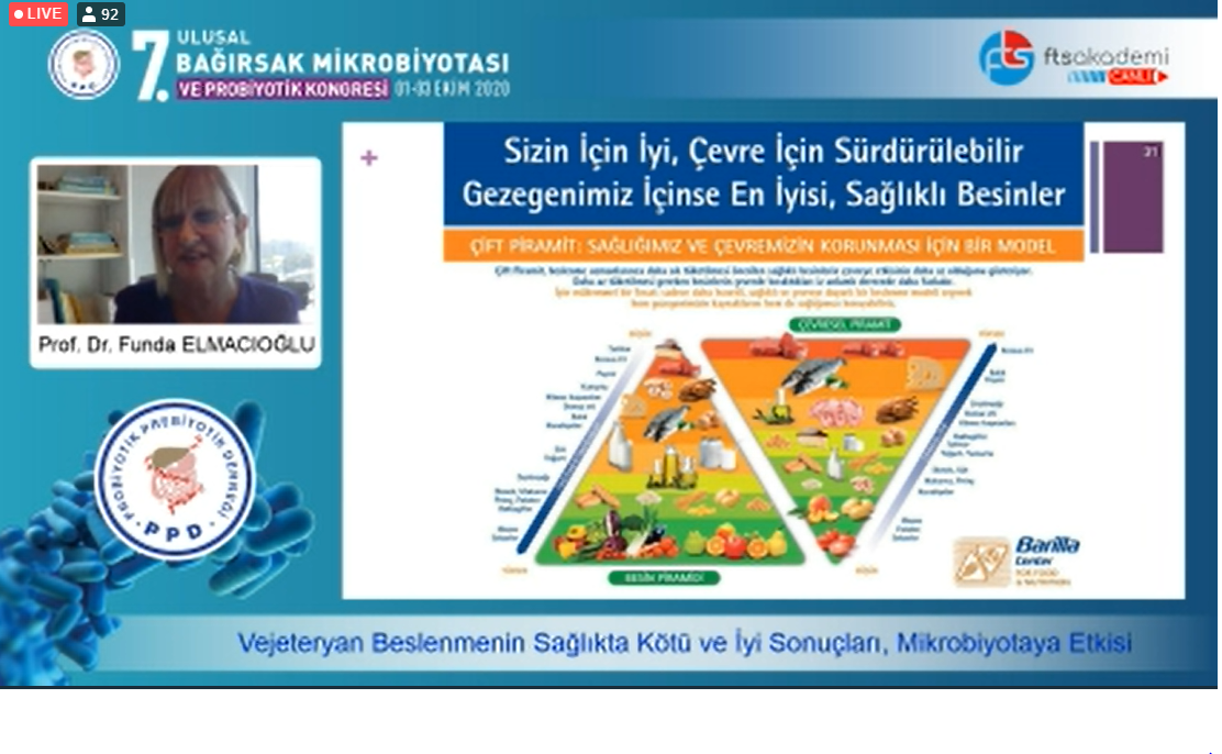 ''Vejetaryen Beslenmenin Sağlıkta Kötü ve İyi Sonuçları, Mikrobiyotaya Etkisi'' adlı sunumu ile vejetaryen diyet türleri, beslenme ve sağlık üzerindeki etkileri, mikrobiyota ve çeşitliliğine etki eden faktörler gibi çeşitli konu başlıkları ile vejetaryen beslenme ve mikrobiyota ilişkisini açıklayan Prof. Dr. Funda Elmacıoğlu ''Sizin İçin İyi, Çevre için Sürdürülebilir Gezegenimiz İçinse En İyisi, Sağlıklı Besinler'' ifadeleri ile besin ve çevresel etmenleri kapsayan, sağlığımız ve çevremizin korunması için bir model olan çift piramidi dinleyicilere aktardı. Çift Piramidin, beslenme uzmanlarınca daha sık tüketilmesi önerilen sağlıklı besinlerin çevreye etkisinin daha az olduğunu ve daha az tüketilmesi gereken besinlerin çevrede bıraktıkları izlerin anlamlı derecede daha fazla olduğunu vurguladı. Sebze ve meyve tüketiminin bağırsak mikrobiyotasında çeşitliliği sağladığını; ancak bu durumun sadece Vejetaryen diyetlere özgü olmadığını, optimal beslenme düzeni ile artan sebze meyve alımının, kısa zincirli yağ asitleri ve mikrobiyal çeşitliliği artırdığını belirtti. Beslenme kılavuzları ve diğer güncel raporların, bitki bazlı diyetleri çevresel sürdürülebilirlik ve sağlık yararları açısından desteklemekte olduğunu; ancak kişisel veya gezegenimizin sağlığı için bitki temelli beslenme modellerine geçiş, mutlaka vegan / vejetaryen olmak anlamına gelmediğini, Akdeniz Beslenme Modelinin yeterli, dengeli ve sürdürülebilir bir beslenme şekli olduğunu son yıllarda yapılmış çalışmalarla vurguladı. Bireyler arası farklılıkların diyet, mikrobiyom ve sağlık sonuçları arasındaki etkileşimlerini tam olarak yorumlayabilmek için daha fazla araştırma yapılmasını gerektiğine değindi. ''Kahvaltı Olmazsa Olur Mu? Bağışıklıkta Ne Kadar Etkili?'' adlı sunumu ile kahvaltının bireyin yaşamındaki önemine vurgu yapan Öğr. Gör. Uzm. Dyt. Selahattin Dönmez kahvaltının bağışıklık üzerindeki etkilerini dinleyicilere konu ile ilgili yapılmış olan güncel çalışmalar ile aktardı.