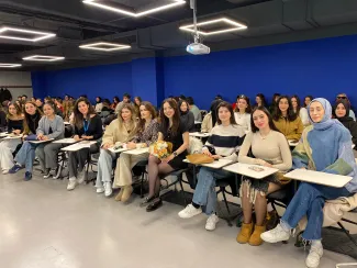 Beslenme ve Diyetetik Bölümü mezunlarımızdan değerli Öykü Yağmur Kavak, “Anaokul Çağı Çocuklarında Beslenme Eğitimi” konulu seminerde öğrencilerimizle bir araya geldi.