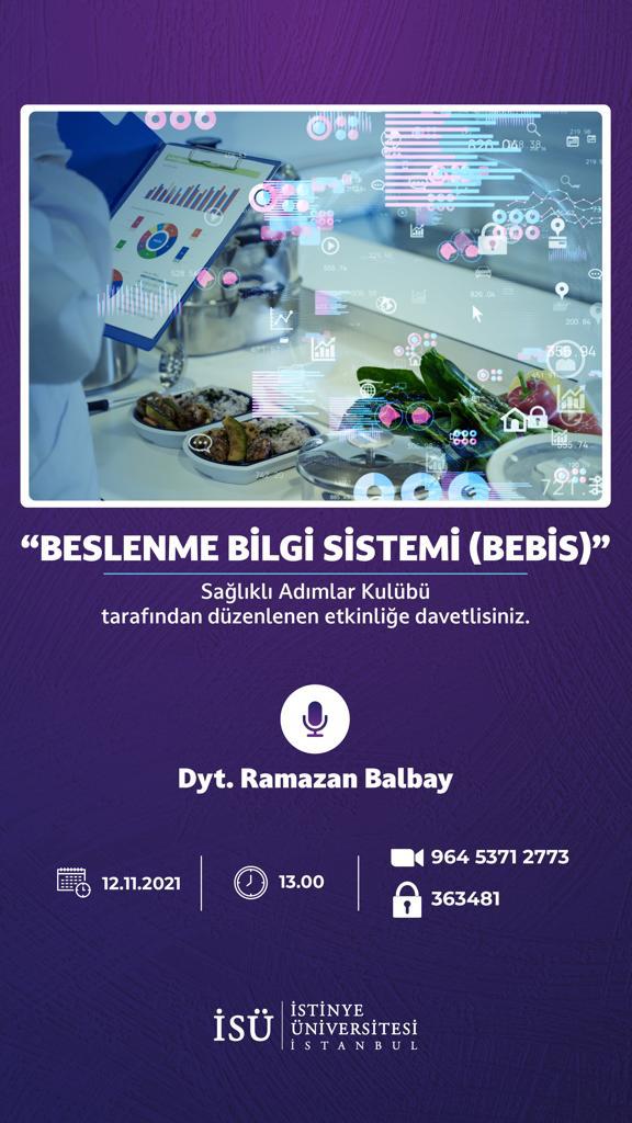 Beslenme ve Diyetetik Bölümü Sağlıklı Adımlar Kulübü etkinliği kapsamında Diyetisyen Ramazan Balbay, Beslenme ve Diyetetik bölümü öğrencilerine Beslenme Bilgi Sistemi programının tanıtımını yapmıştır. Sağlıklı Adımlar Kulübü, öğrencilerimizi Beslenme ve Diyetetik eğitim sürecinde ve mezuniyet sonrası Diyetisyenlerin günlük çalışmasında önemli bir yere sahip olan BeBis programı ile buluşturmuştur. Eğitim kapsamında programın içeriği, kapsamı, kullanımı ve ulaşımı ile ilgili bilgiler sunulmuştur.