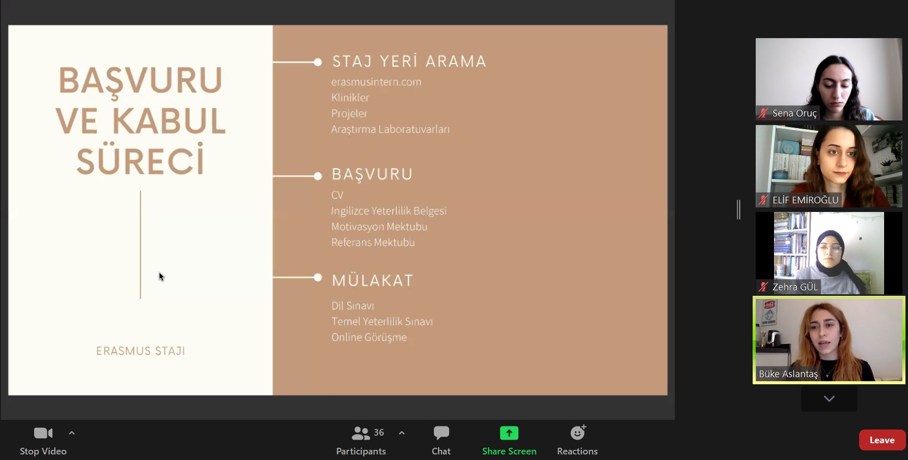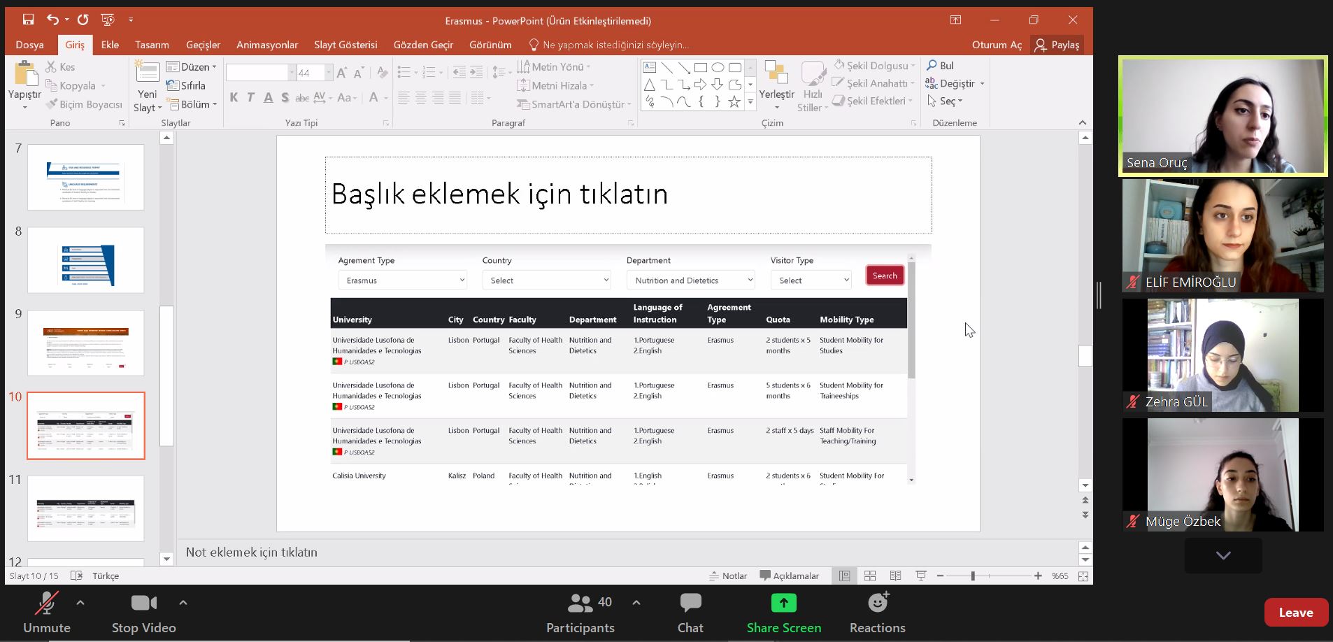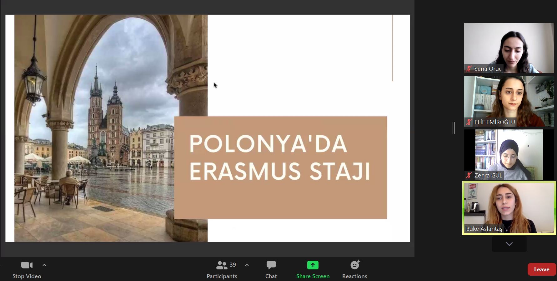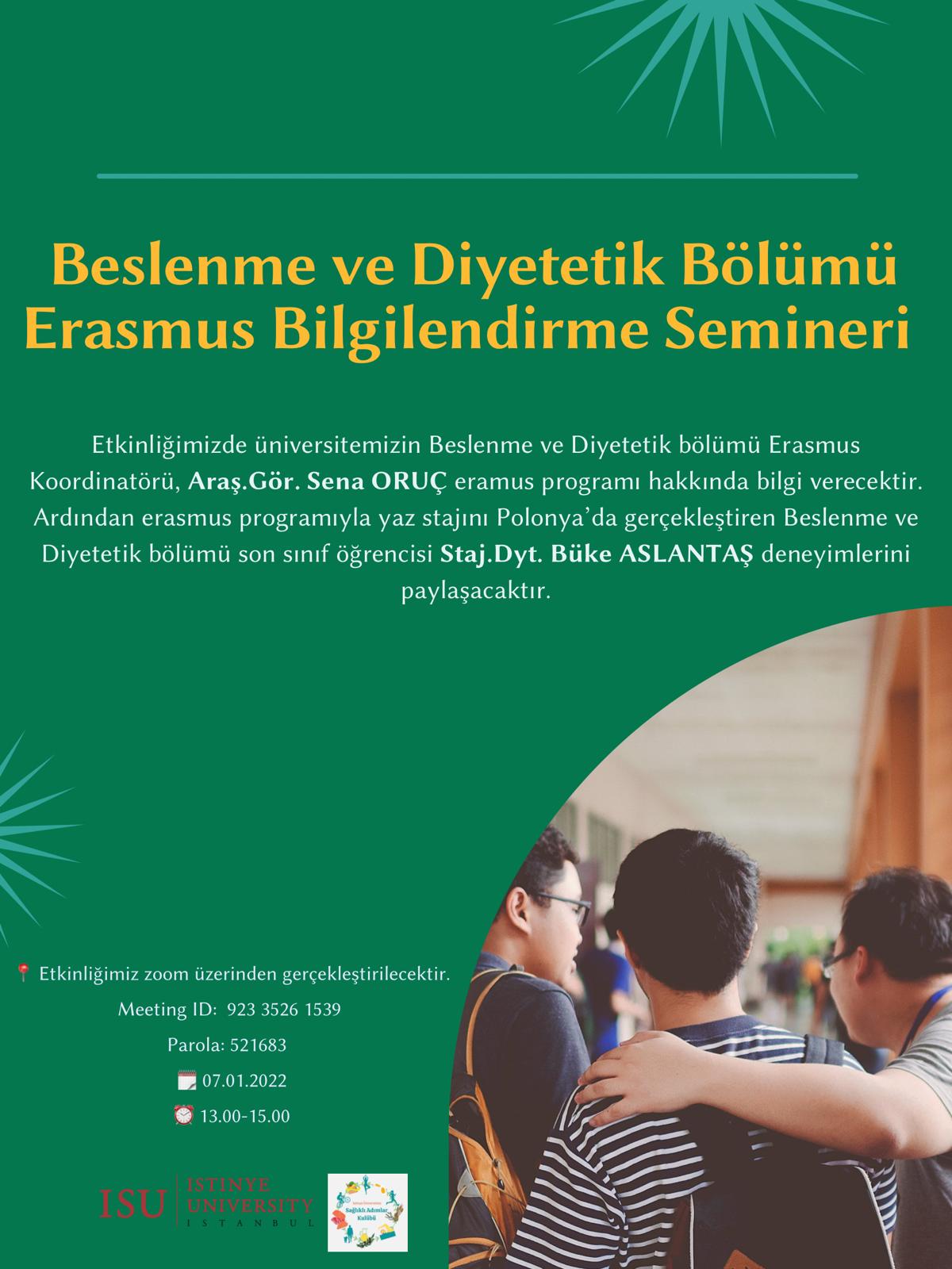 Beslenme ve Diyetetik Bölümü Erasmus Koordinatörü Arş. Gör. Sena ORUÇ ve son sınıf öğrencimiz Büke ASLANTAŞ'ın katılımı ile 7 ocak 2022 tarihinde gerçekleştirilen etkinlikte, Bölümümüzün Erasmus imkanları ve öğrencimizin Erasmus tecrübesi hakkında keyifli bir söyleşi gerçekleştirildi.