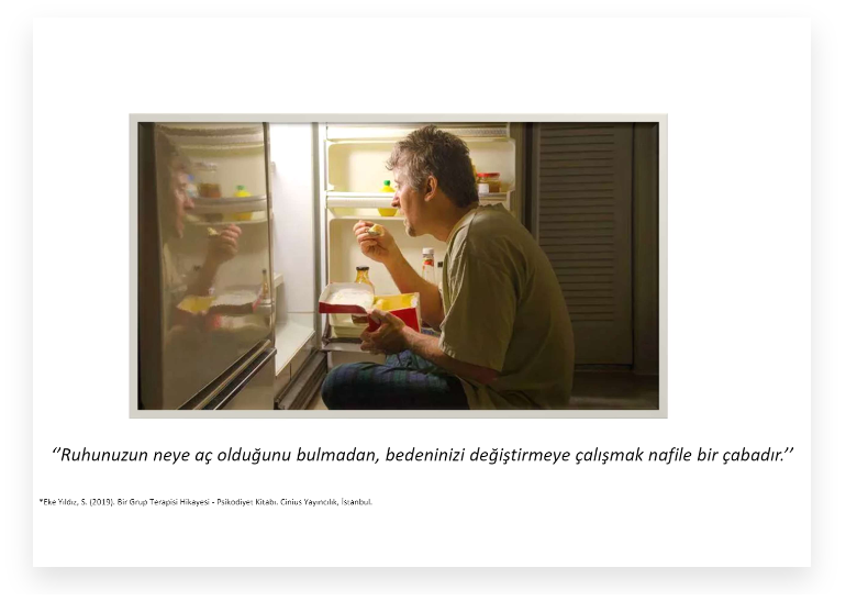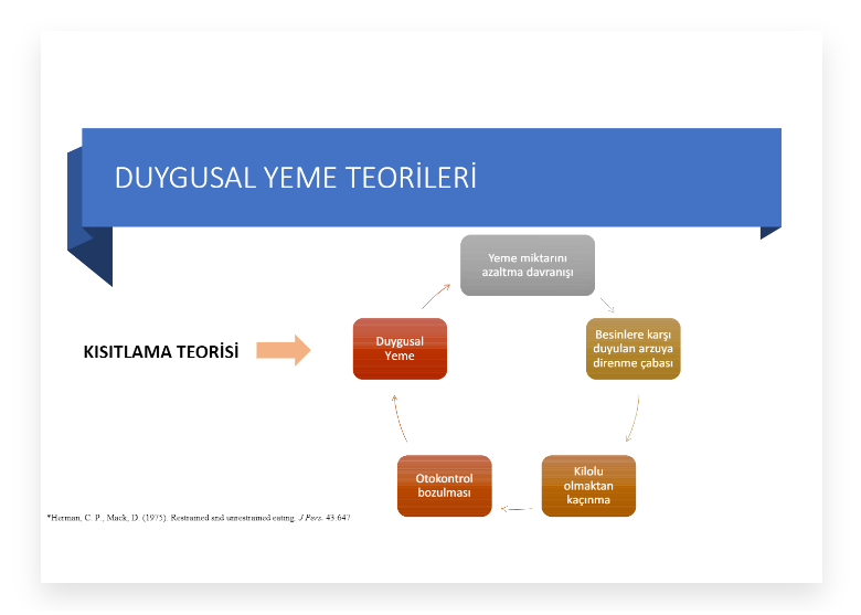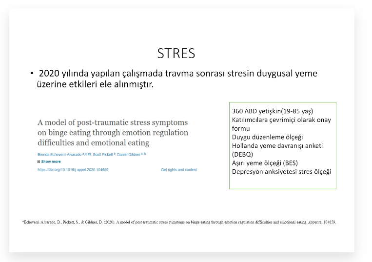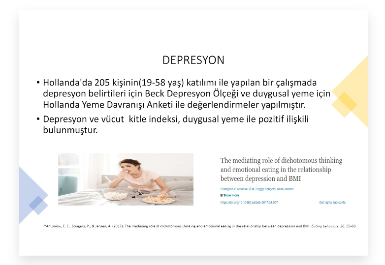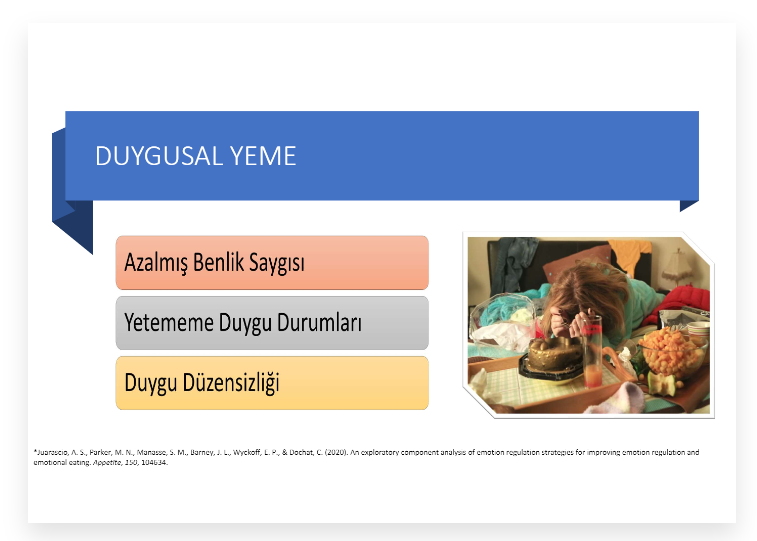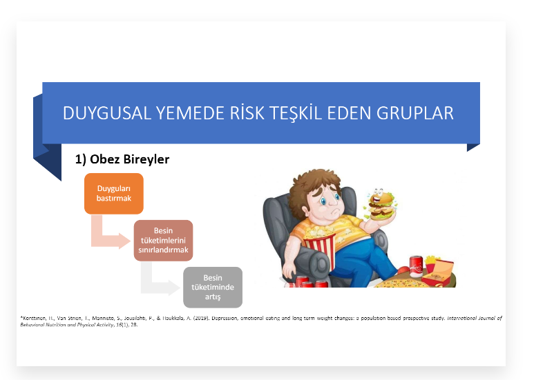 Bireylerin içerisinde bulunduğu duygular bireylerin yeme davranışlarına etki etmektedir. Bu duygu durumlarında bireyler yemek yemeye eğilim gösteriyor ise ortaya çıkan durum ''duygusal yeme'' olarak ifade edilmektedir, ifadeleri ile sunumunu anlatan Ezgi Şen, konu hakkında yapılmş olan çalışmalara ve bu yeme eğiliminin artış gösterdikçe obezite için bir risk faktörü oluşturduğuna değinmiştir.