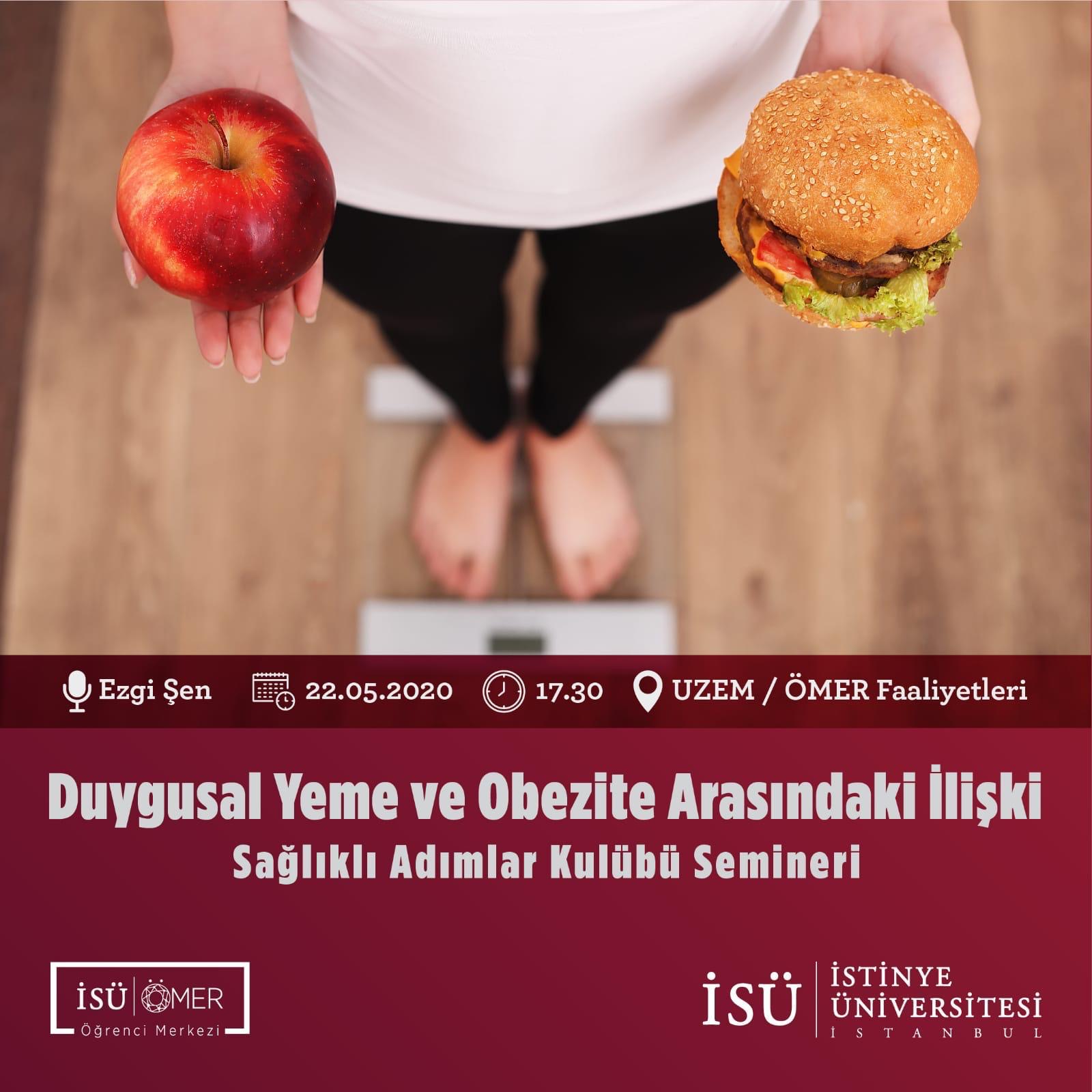 İstinye Üniversitesi, Sağlık Bilimleri Fakültesi Beslenme ve Diyetetik Bölümü 4. sınıf öğrencisi Ezgi Şen tarafından ''Duygusal Yeme ve Obezite Arasındaki İlişki'' konulu seminer 22 Mayıs 2020 tarihinde üniversite öğrenci ve akademisyenlerinin katılımı ile gerçekleştirilmiştir.