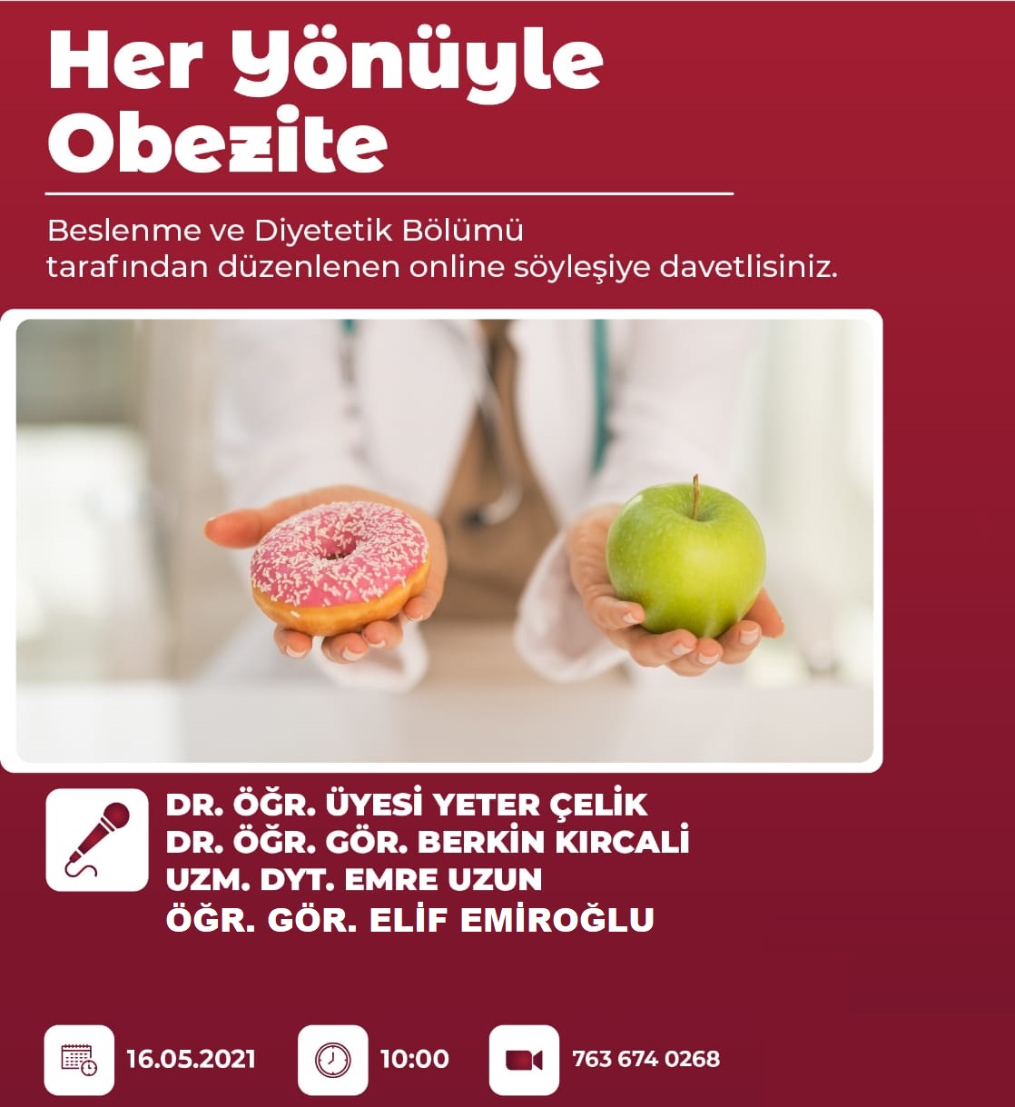 Beslenme ve Diyetetik Bölümü öğretim elemanları ve Uzm. Dyt. Emre UZUN'un konuşmacı olarak katılımı ile 16.05.2021 tarihinde gerçekleştirilen 'Her Yönüyle Obezite' başlıklı etkinlikte; obeziteden korunma ve obezitenin yönetimine ilişkin tüm uygulamalar, Beslenme ve Diyetetik Bilim Dalı'nın farklı alanları açısından ele alındı.
