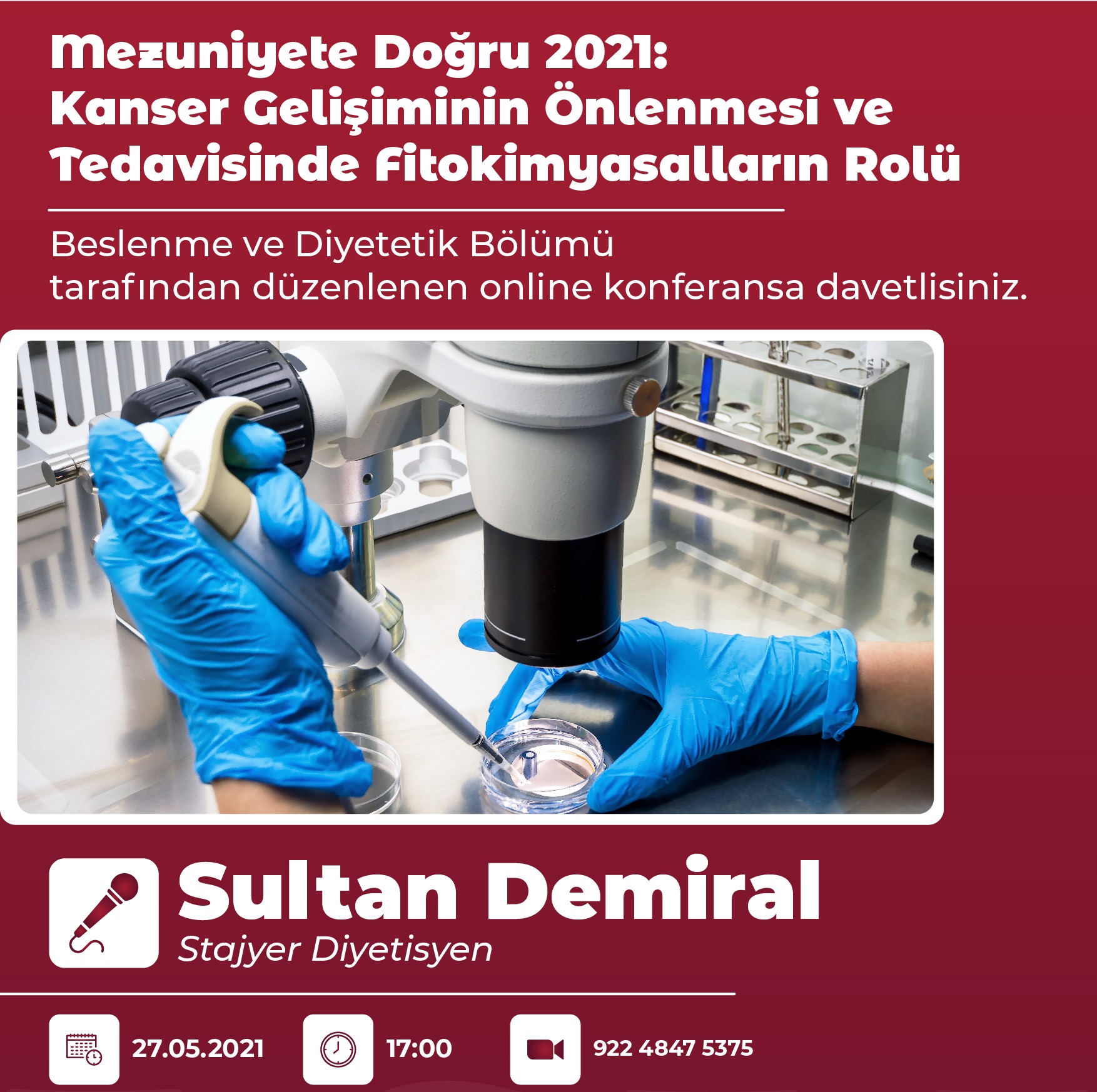 İstinye Üniversitesi Beslenme ve Diyetetik Bölümü son sınıf öğrencisi Stajyer Diyetisyen Sultan DEMİRAL'ın konuşmacı olarak katılımı ile ‘’Mezuniyete Doğru 2021: ‘’Kanser Gelişiminin Önlenmesi ve Tedavisinde Fitokimyasalların Rolü’’ adlı seminer gerçekleştirildi.