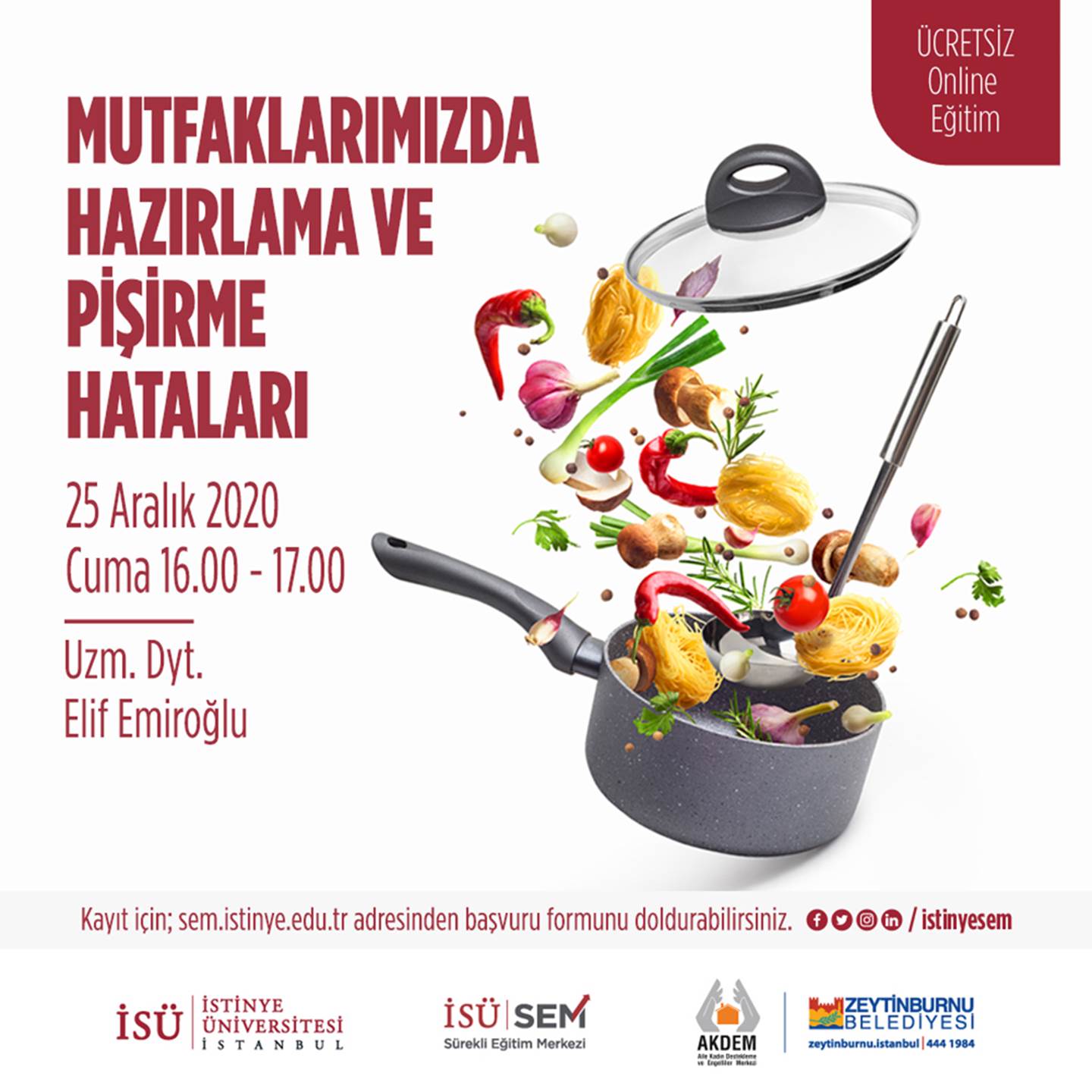 Zeytinburnu Belediyesi AKDEM ve İstinye Üniversitesi Sürekli Eğitim Merkezi İşbirliği ile düzenlenen ve İSÜ Beslenme ve Diyetetik Bölümü'nün katkıları ile gerçekleştirilen ''Pandemi Döneminde Beslenme: Eğitim Seminerleri Serisi'' kapsamında, 25 Aralık 2020 tarihinde Öğr. Gör. Elif EMİROĞLU ''Mutfaklarımızda Hazırlama ve Pişirme Hataları'' başlıklı sunumunu gerçekleştirdi.