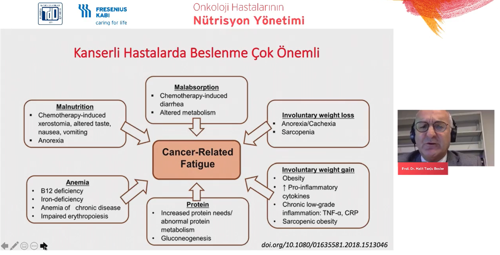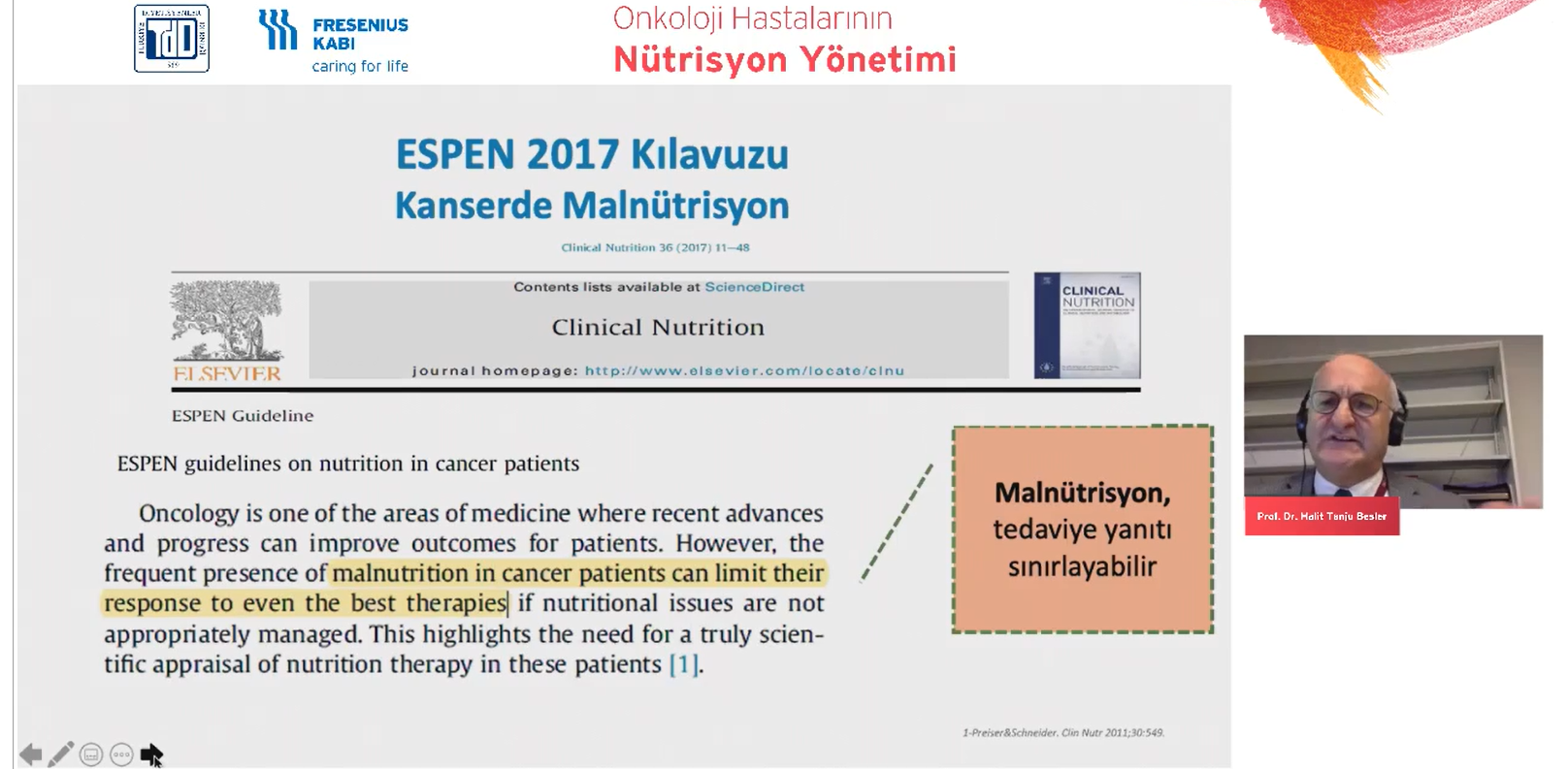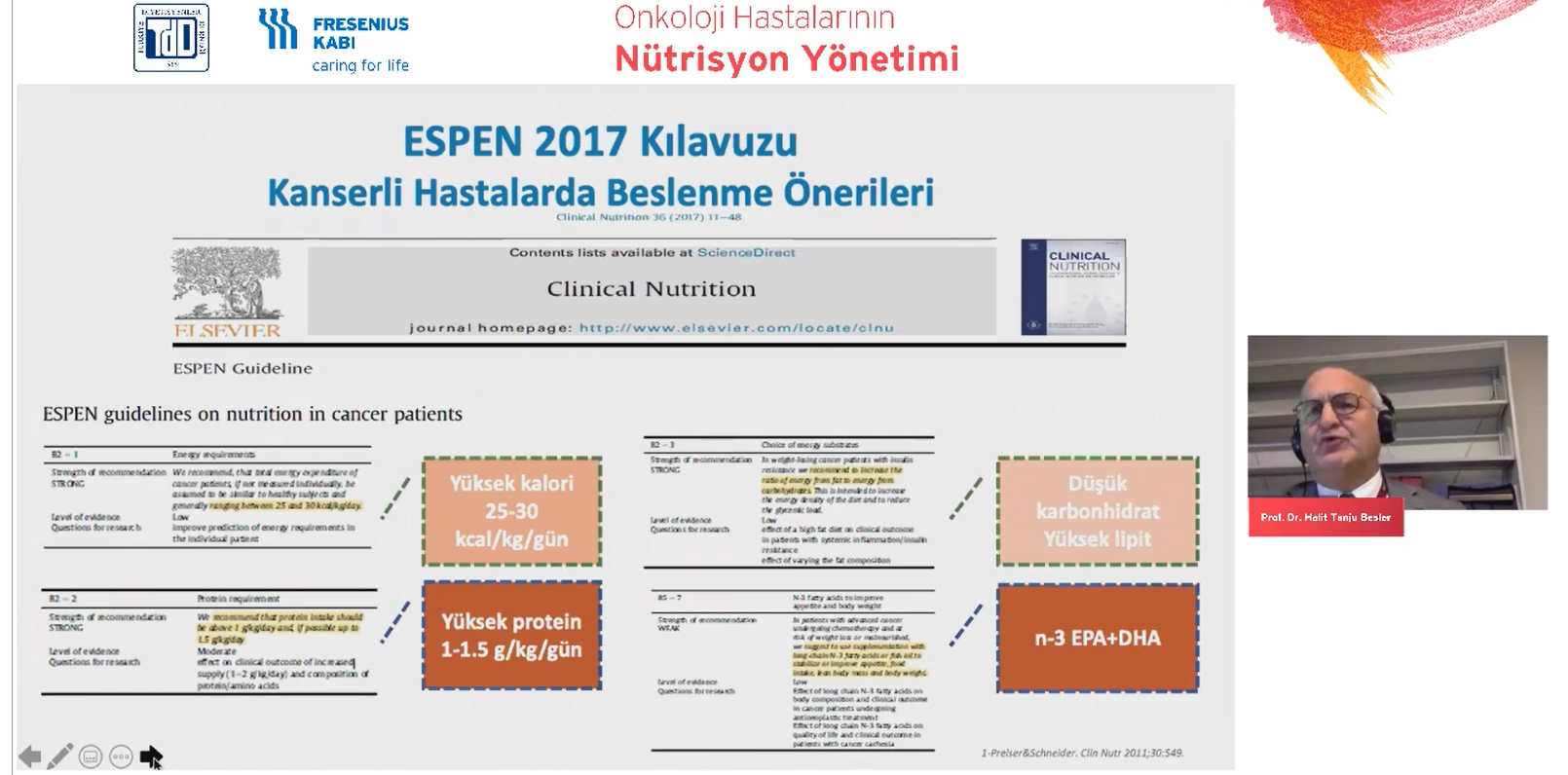 Prof. Dr. H. Tanju BESLER, 8 Ekim 2020 tarihinde TDD tarafından düzenlenen 'Onkoloji Hastalarının Nutrisyon Yönetimi' etkinliğinde 'Onkoloji Hastalarında Balık Yağı ve Glutaminin Yeri: Kime, Ne zaman, Ne kadar' başlıklı sunumunu gerçekleştirdi.