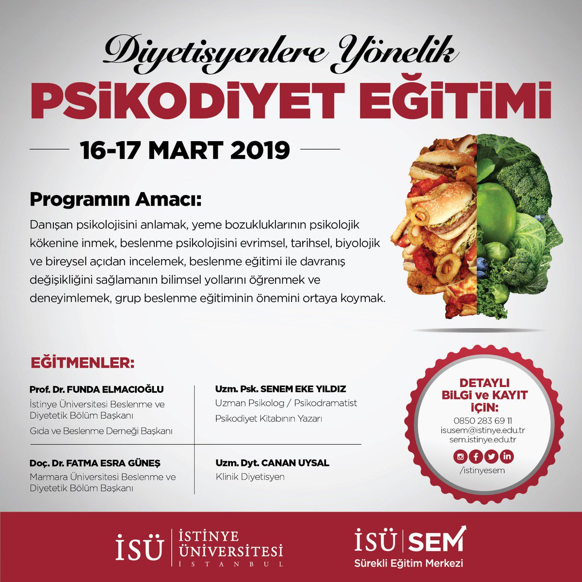 İstinye Üniversitesi Sağlık Bilimleri Fakültesi Beslenme ve Diyetetik Bölüm Başkanı Prof. Dr. Funda Elmacıoğlu koordinatörlüğünde yürütülen programda, eğitmen olarak “Psikodiyet” kitabının yazarı Uzm. Psk. Senem Eke Yıldız, Marmara Üniversitesi SBF Beslenme ve Diyetetik Bölüm Başkanı Doç. Dr. Fatma Esra Güneş ve Üsküdar Üniversitesi SBF Beslenme ve Diyetetik Bölümü Öğretim Görevlisi Uzm. Dyt. Canan Uysal görev aldı.
