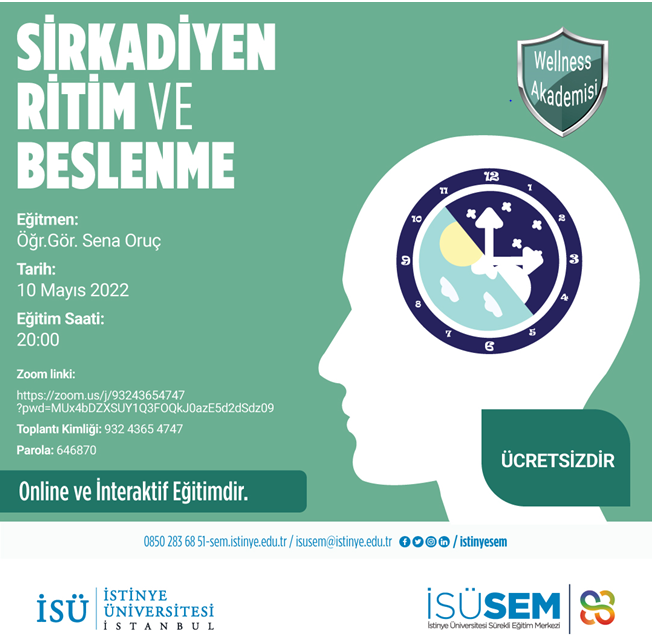 İstinye Üniversitesi Sürekli Eğitim Merkezi tarafından düzenlenen ve Arş. Gör. Sena Oruç'un konuşmacı olduğu 'Sirkadiyen Ritim ve Beslenme' başlıklı etkinlik 10 Mayıs 2022 tarihinde 108 katılımcı ile gerçekleştirildi.