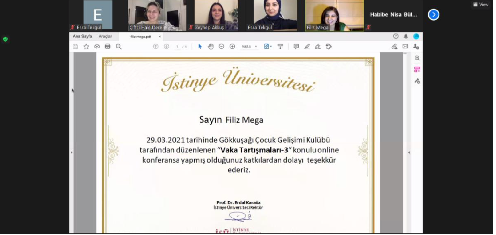 İstinye Üniversitesi Gökkuşağı Çocuk Gelişimi Kulübü, 29 Mart 2021 tarihinde Zoom üzerinden saat 19.00'da, Uzman Klinik Psikolog Filiz Mega ile “Vaka Tartışmaları-3” konulu konferansı gerçekleştirmiştir.