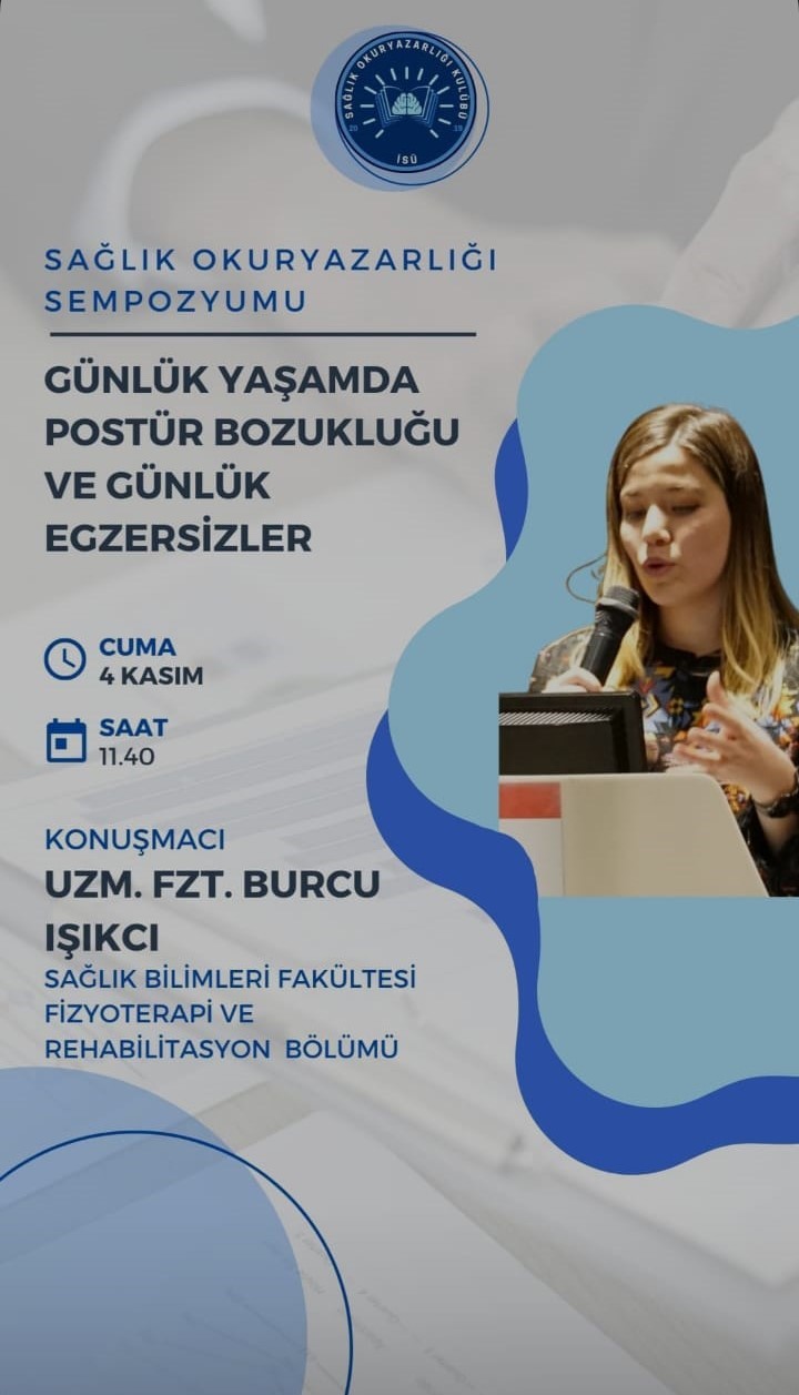 Arş. Gör. Burcu Işıkcı, 4 Kasım 2022 Cuma günü İstinye Üniversitesi Kongre Merkezi'nde gerçekleştirilen "Farklı Dallar Farklı Bakışlar: Sağlık Okuryazarlığı" başlıklı sempozyumumuzda "Günlük Yaşamda Postür Bozukluğu" başlıklı konuşması ile yer almıştır.