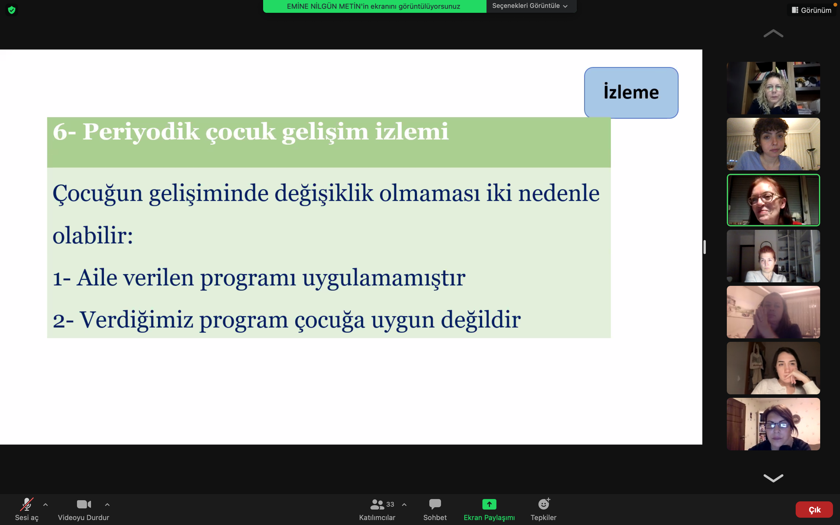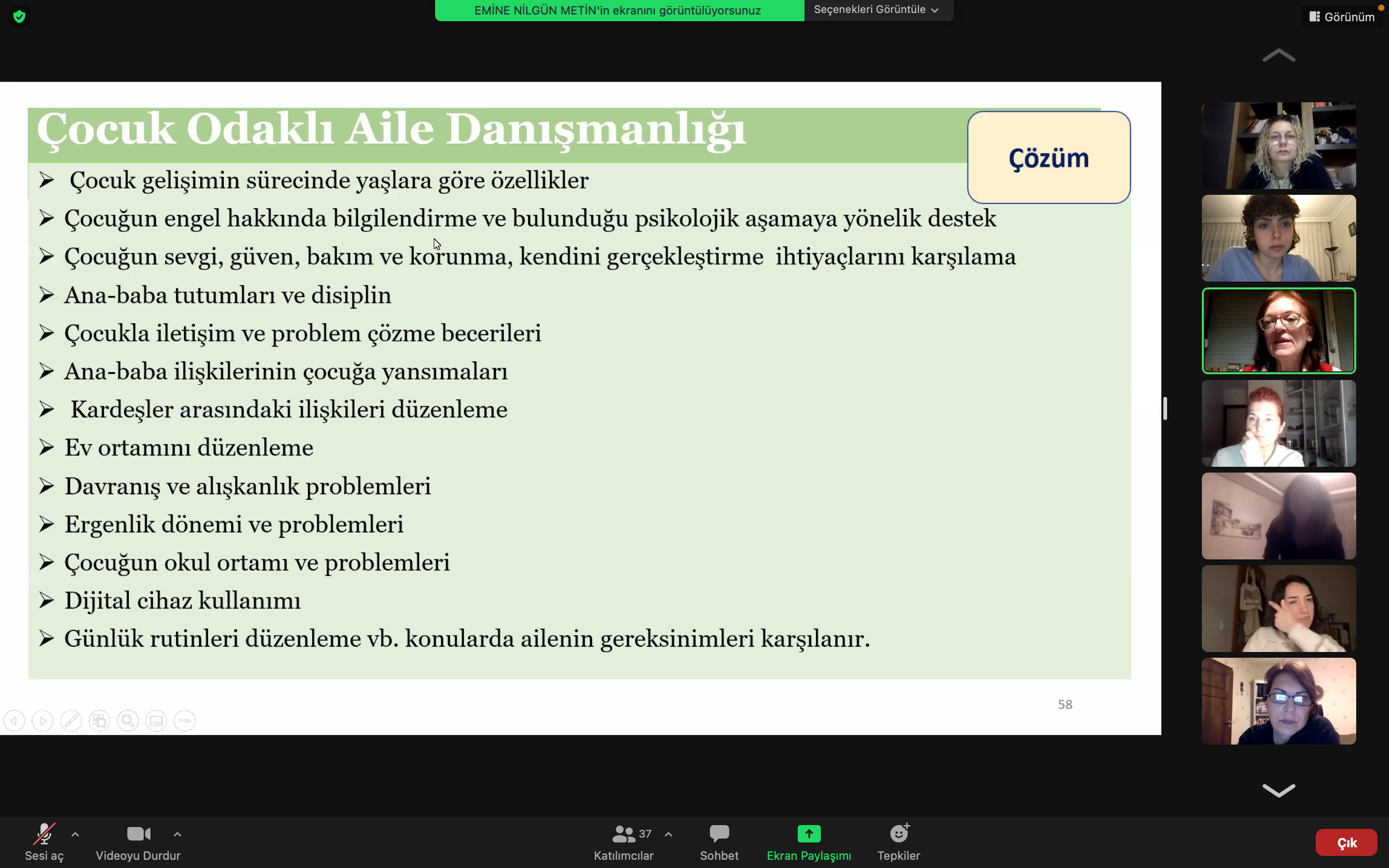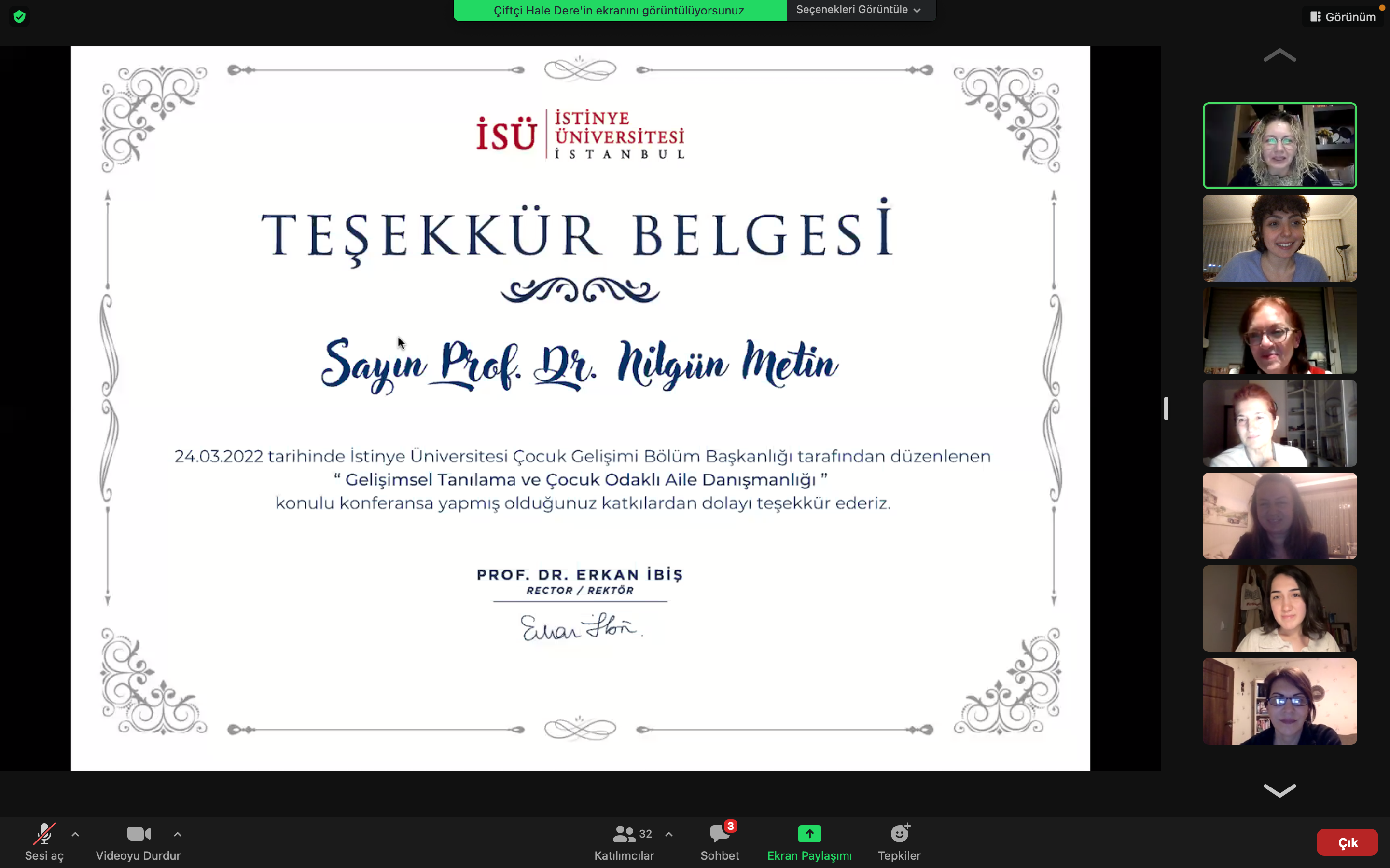 Çocuk Gelişimi Bölümü tarafından düzenlenen 'Gelişimsel Tanılama ve Çocuk Odaklı Aile Danışmanlığı' konulu seminer Prof. Dr. Nilgün Metin' in anlatımıyla 25.03.2022 tarihinde online olarak gerçekleştirilmiştir. Davetimizi kabul ettiği ve değerli bilgilerini öğrencilerimiz ile paylaştığı için Prof. Dr. Nilgün Metin'e ve bizlerle birlikte olan tüm katılımcılarımıza teşekkür ederiz.