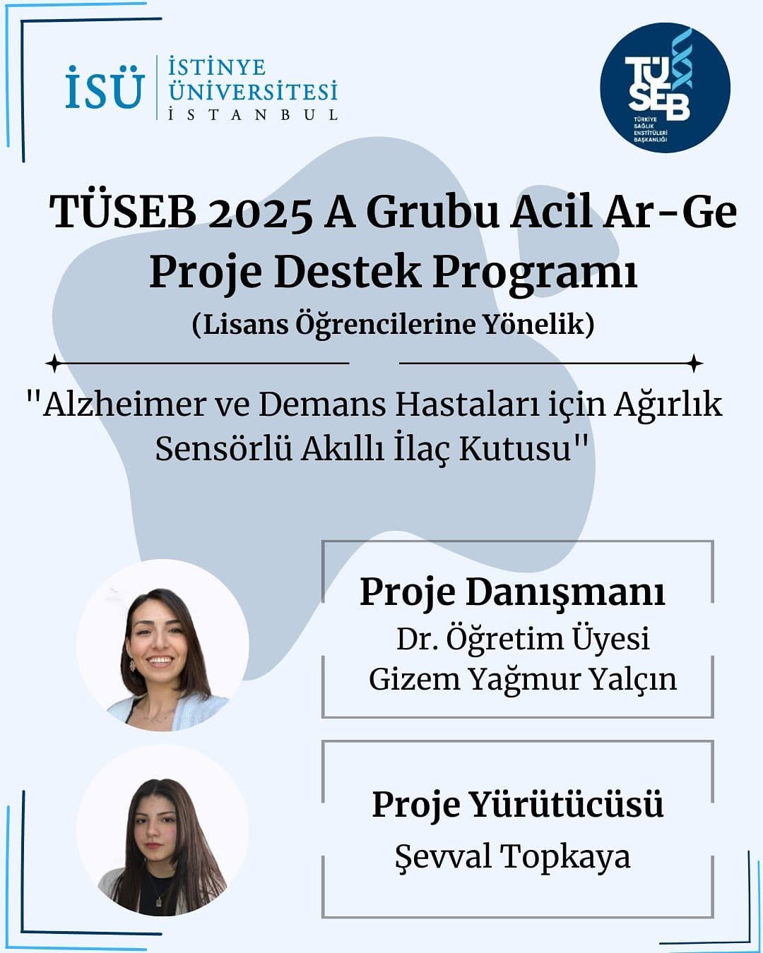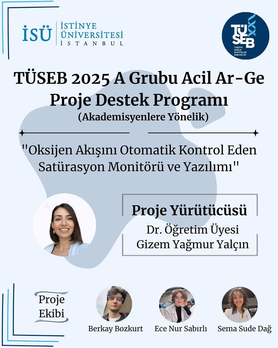 İstinye Üniversitesi bünyesinde yürütülen, İngilizce Hemşirelik Bölümü öğretim üyelerimizden Dr. Öğretim Üyesi Gizem Yağmur Yalçın’ın yürütücülüğünü üstlendiği”Oksijen Akışını Otomatik Kontrol Eden Satürasyon Monitörü ve Yazılımı” ve “Alzheimer ve Demans Hastaları için Ağırlık Sensörlü Akıllı İlaç Kutusu” başlıklı projeler, TÜSEB 2025 A Grubu Acil Ar-Ge Proje Destek Programı (Akademisyenlere Yönelik) kapsamında desteklenmeye hak kazanmıştır. Öğretim üyemizi ve öğrencilerimizi bu başarılarından dolayı tebrik eder, çalışmalarında başarılar dileriz.