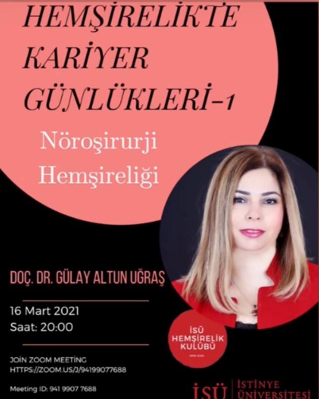 Hemşirelik Kulübünün düzenlediği Doç. Dr. Gülay Altun Uğraş hocamızın anlatımı ile "Hemşirelikte Kariyer Günlükleri-1" etkinliği Nöroşirurji Hemşireliği konusunda 16 Mart Salı günü gerçekleştirildi. Prof. Dr. Neriman Akyolcu, Prof. Dr. Samiye Mete ve Dr. Öğr. Üyesi Sennur Kula Şahin hocalarımızın katılımı ile zenginleşen etkinlikte hemşirelik öğrencilerinin kariyer planlaması ile ilgili soruları cevaplandı.