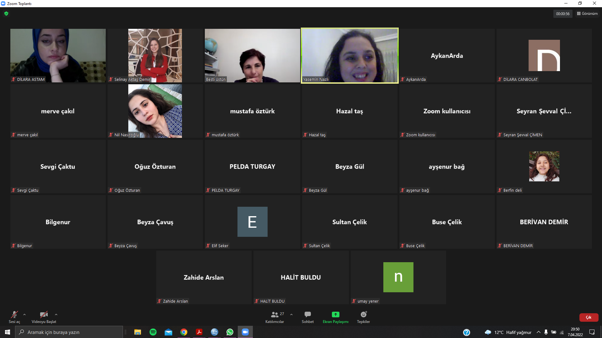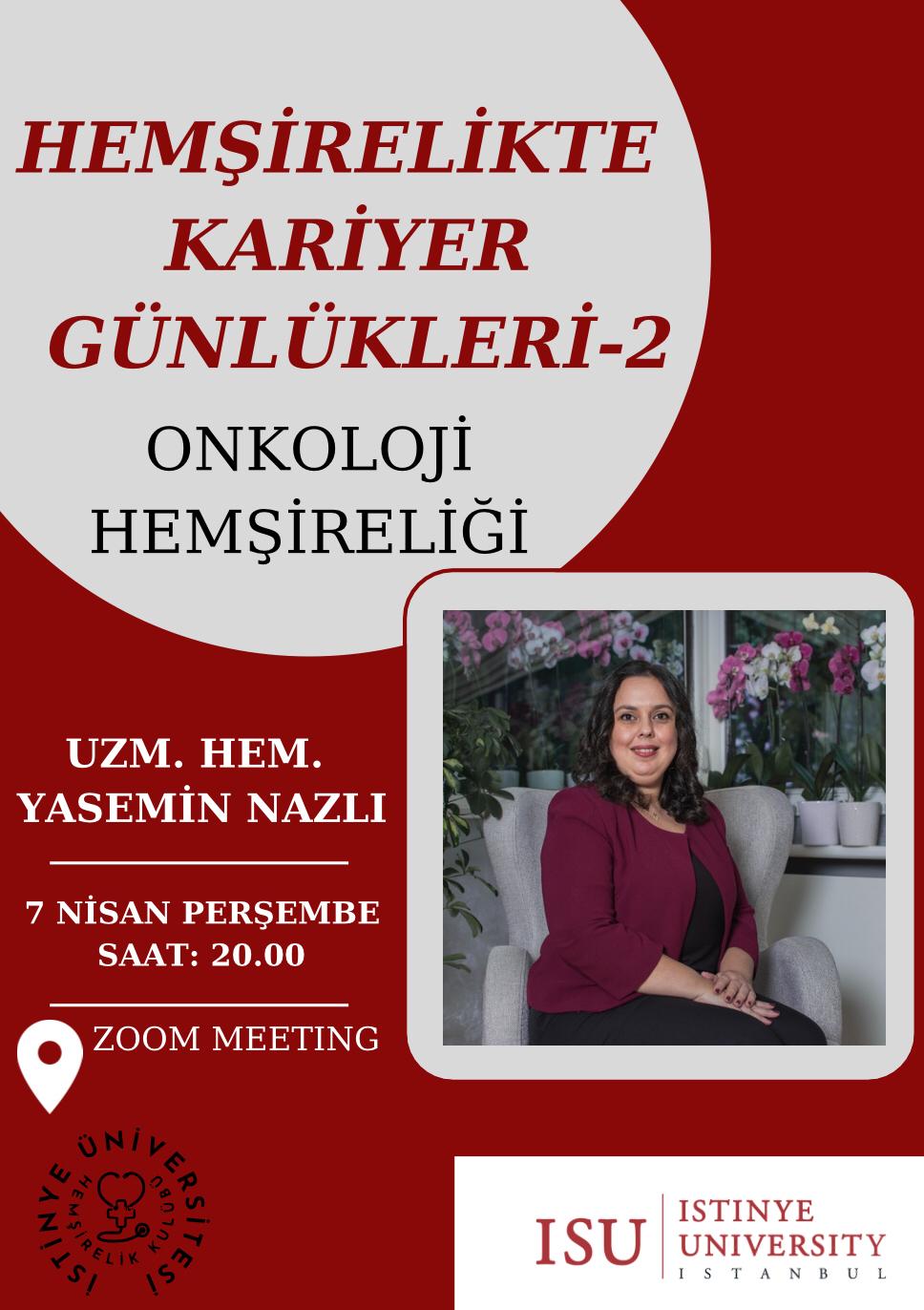 7 Nisan Perşembe günü Hemşirelikte Kariyer Günlüklerinin 2.si Onkoloji Hemşireliği konu altında online olarak gerçekleştirilmiştir. Uzman Hemşire Yasemin Nazlı'nın davetli konuşmacı olduğu etkinlikte Onkoloji Hemşireliği ile ilgili seminer gerçekleştirmiştir. Öğrencilerimizin merak ettiği soruları yanıtlayan Uzm. Hemş. Yasemin Nazlı'ya davetimizi kabul ettiği ve bol etkileşimle değerli bilgilerini öğrencilerimiz ile paylaştığı için ve bizimle birlikte olan tüm katılımcılarımıza teşekkür ederiz.