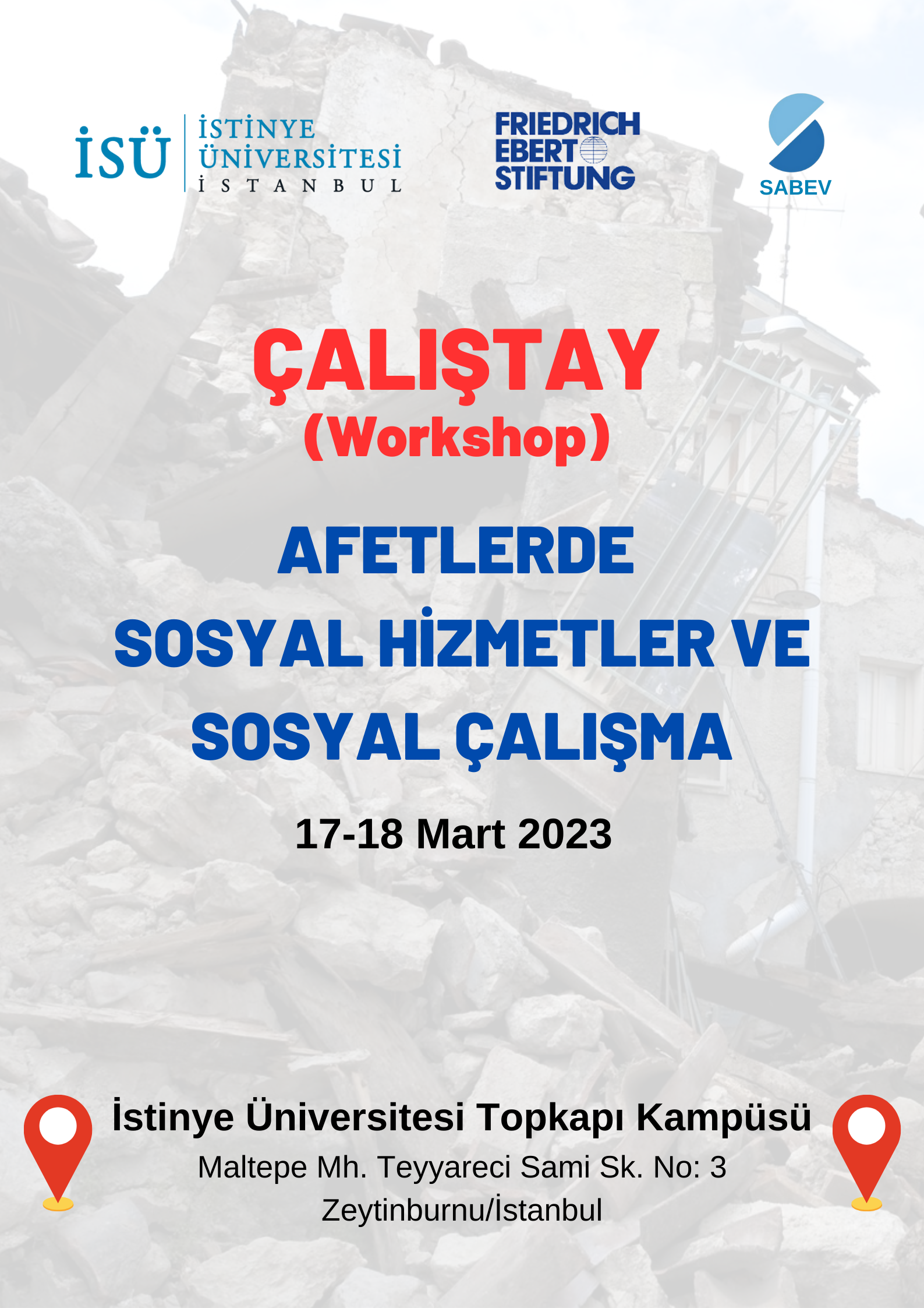 17-18 Mart 2023 tarihlerinde İstinye Üniversitesi Topkapı Kampüsü'nde "Afetlerde Sosyal Hizmetler ve Sosyal Çalışma Çalıştayı" düzenlendi. Aile ve Sosyal Hizmetler Bakanlığı, İstanbul Büyükşehir Belediyesi, Sığınmacılar ve Göçmenlerle Dayanışma Derneği, Hayata Destek Derneği çalışanları ve farklı üniversitelerden gelen akademisyenler çalıştaya katılarak destek verdi. Türkiye'nin farklı bölgelerinden gelen yaklaşık 50 katılımcının olduğu çalıştayda yakın zamanda ülkemizde meydana gelen deprem felaketi ele alındı. Çalıştay raporunun en kısa sürede hazırlanıp yayımlanması planlanmaktadır.