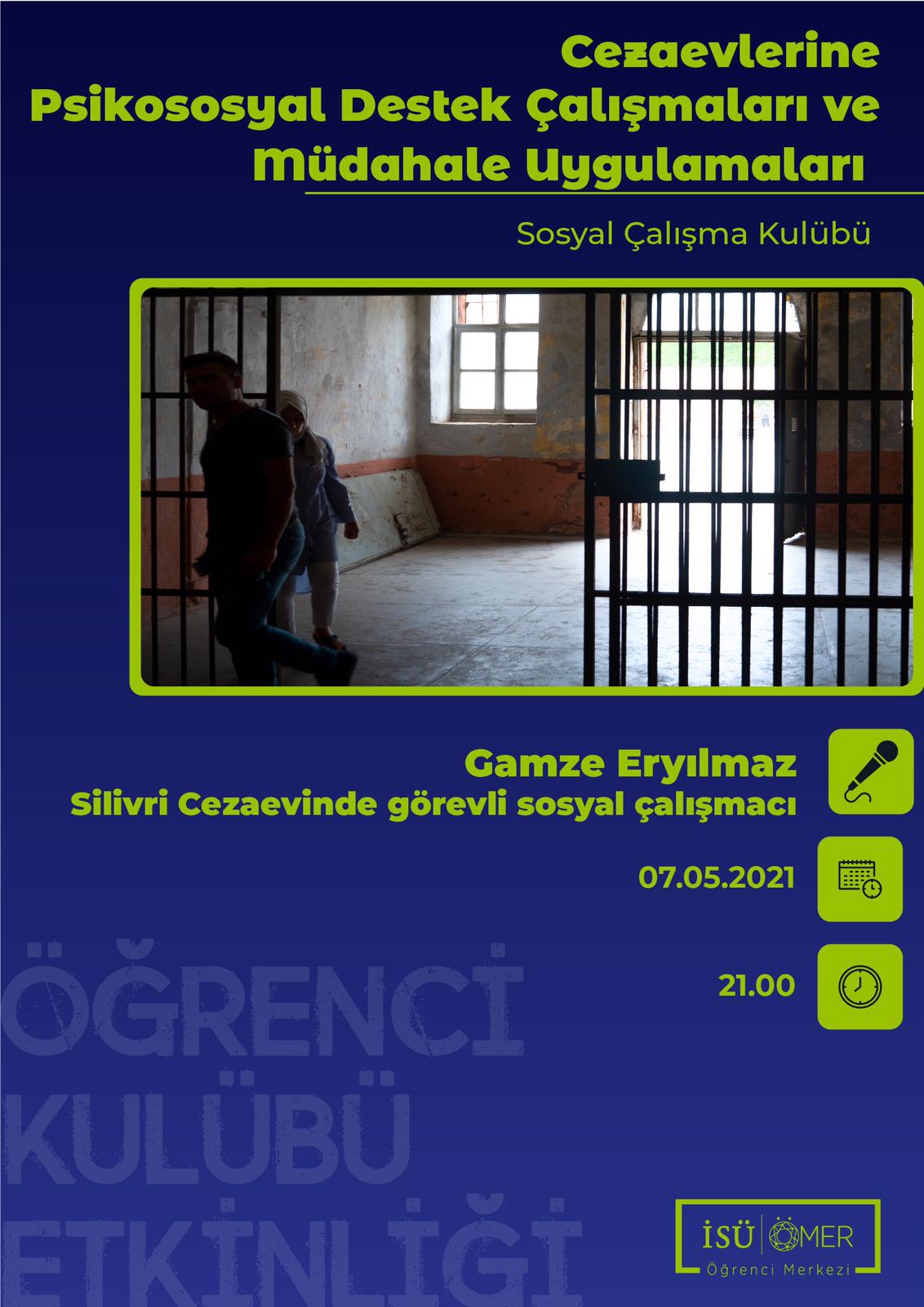 Sosyal Çalışma Kulübü'nün önderliğinde Silivri Cezazevinde sosyal çalışmacı olarak görev yapan Sayın Gamze Eryılmaz'ın katılımıyla "Cezaevlerinde Psikososyal Destek Çalışmaları ve Müdahale Uygulamaları" konulu etkinlik gerçekleştirildi.
