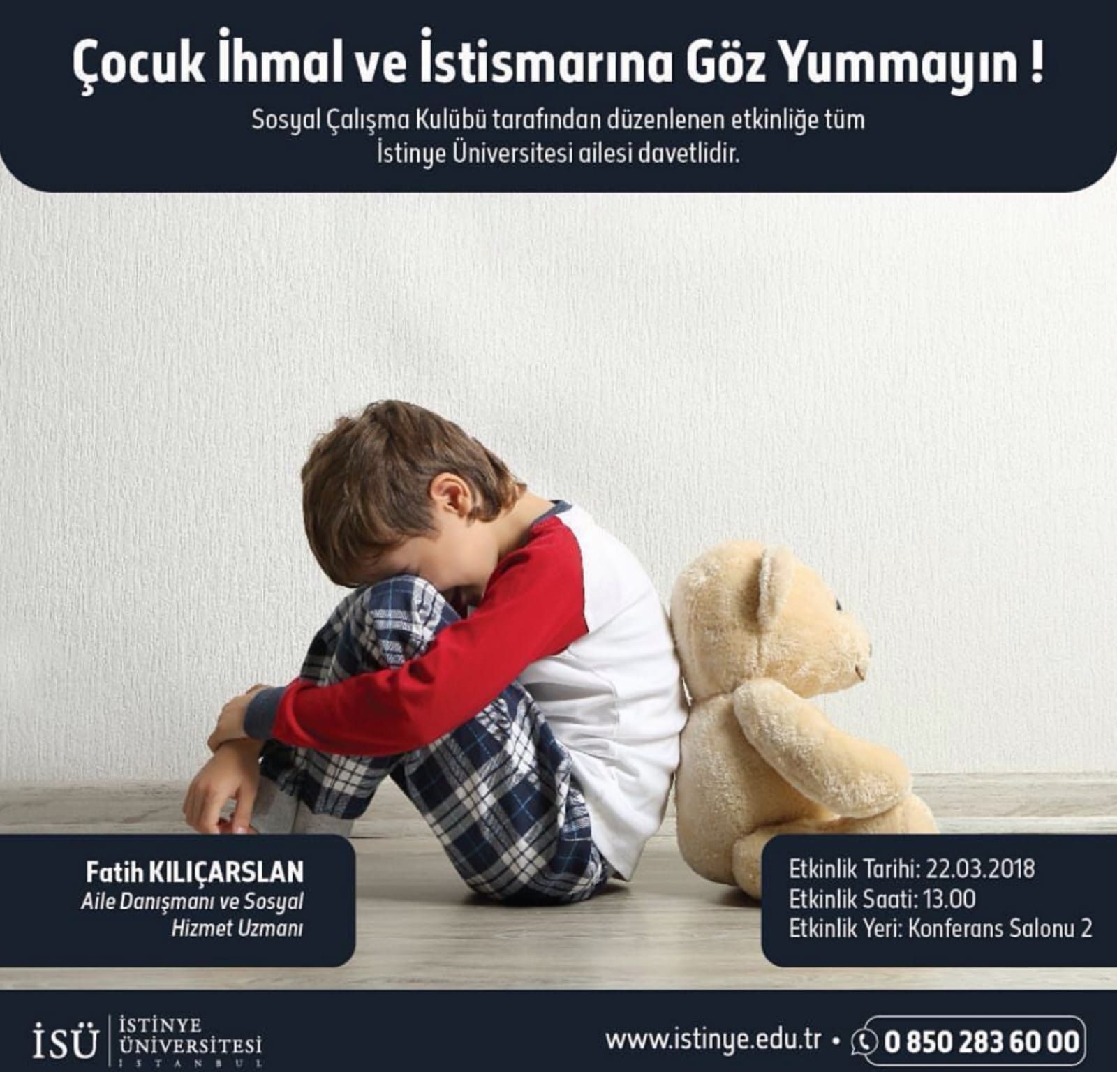 22.03.2018 tarihinde Sosyal Çalışma Kulübü ve Sosyal Hizmet Bölümü tarafından düzenlenen “Çocuk İhmali ve İstismarı” konulu etkinlikte değerli konuşmacımız Aile Danışmanı ve Sosyal Hizmet Uzmanı Fatih Kılıçarslan, öğrencilere bilgilendirme yaptı. Hem dünyada hem ülkemizde, istismara uğrayan çocuk sayısı her geçen gün arttığına, çok büyük bir toplumsal sorun haline gelen bu konuda uzmanların kendi paylarına düşen görevleri ve sorumluluklarına dikkat çekildi. Etkinlikte sosyal çalışmacılar olarak ne yapılmalı, hangi birimlerle koordine olunmalı, ülkemizde istismarı azaltmak hatta yok etmek için ne gibi projeler gerçekleştirilmeli konularında bir tartışma ortamı oluştu.