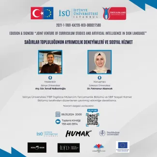 SBF Sosyal Hizmet Bölümü ve İTBF İngilizce Mütercim Tercümanlık Bölümü iş birliğiyle "Sağırlar Topluluğunun Ayrımcılık Deneyimleri ve Sosyal Hizmet" konulu bir etkinlik düzenlendi. Etkinlik, işaret dili ve yapay zeka alanında ortak müfredat çalışmaları üzerine odaklanan EDUSIGN & SIGNEDU projesinin bir parçası olarak gerçekleştirildi. Etkinlik kapsamında Sakarya Üniversitesi Sosyal Hizmet Bölümü'nden Dr. Fatmanur Alsancak konferans verirken moderatörlüğü İstinye Üniversitesi Sosyal Hizmet Bölümü'nden Arş. Gör. İsmail Nalbantoğlu gerçekleştirdi.