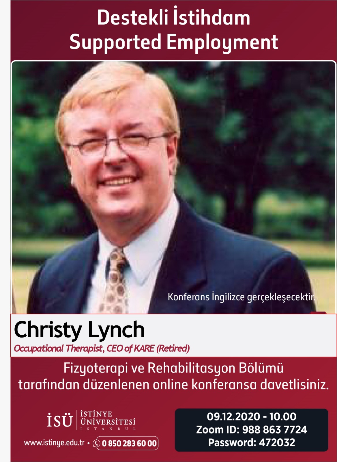 Job Coaching dersi kapsamında bu alanda önemli bir isim olan Christy Lynch (Occupational Therapist, CEO of KARE-Retired) ile "Destekli İstihdam" isimli online konferansımız gerçekleştirildi. Engeli olan kişilere yönelik KARE adlı kuruluşun kurucusu ve Ceo’su olarak yıllarca çalışmış ve Ülkemiz de dahil olmak üzere Avrupa’da ve diğer kıtalarda pek çok ülkede Destekli İstihdam’ın tanınması ve yerleşmesi için önemli çalışmalar yapmış olan Lynch öğrencilerimiz ve katılımcılar ile bu konferans aracılığı ile tanıştı ve onlara deneyimlerini aktardı.