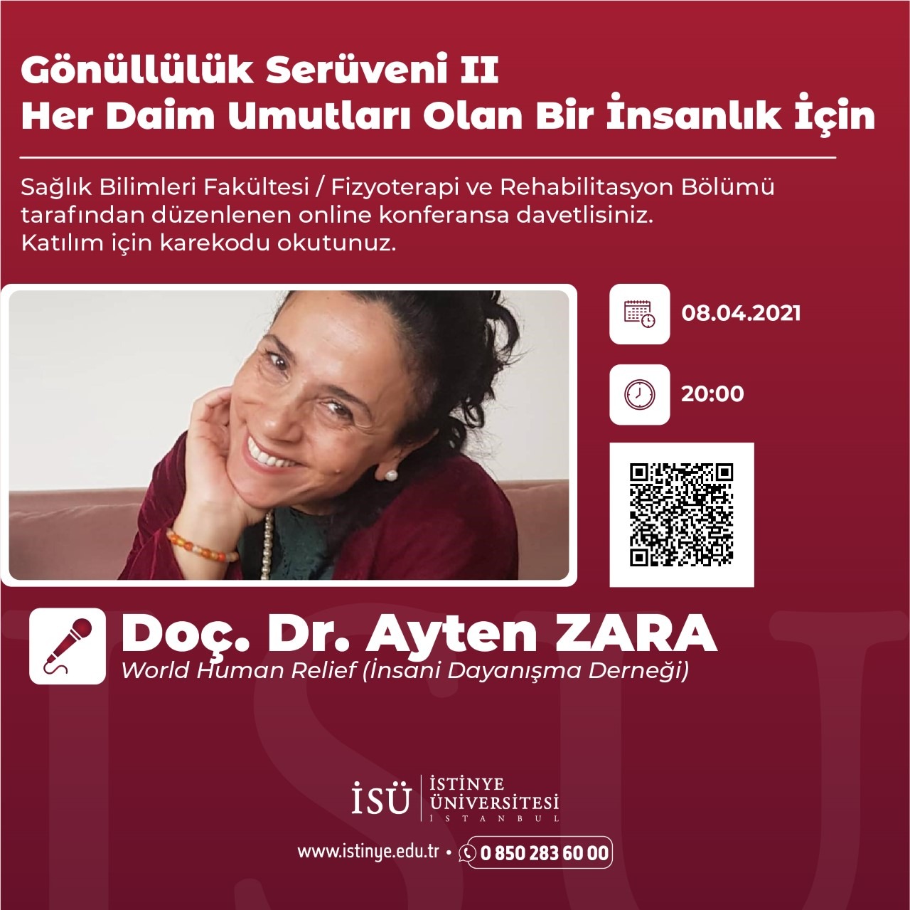 Fizyoterapi ve Rehabilitasyon Bölümü Dr. Öğr. Üyesi Nurgül D. ELBAŞI'nın koordinatörlüğünde 'Gönüllülük Serüveni II Her Daim Umutları Olan İnsanlık İçin' konulu söyleşi gerçekleştirildi. Worl Human Relief kurucusu Doç. Dr. Ayten ZARA 'Sevgi Dolu, Barışçıl ve Ebediyen Umutları Olan Bir İnsanlık İçin... Güneş Ol..' sloganıyla yola çıktıkları süreç ve gönüllülük hakkında bilgilerini aktardı.