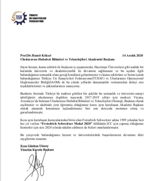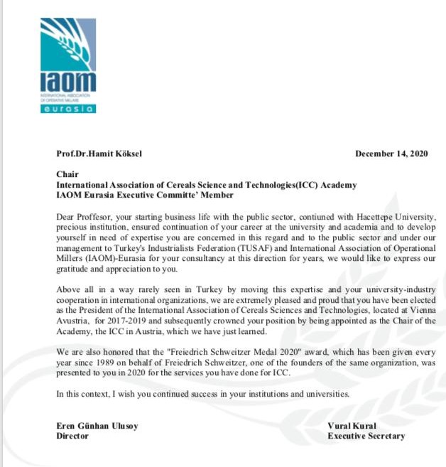 İstinye Üniversitesi Sağlık Bilimleri Fakültesi Beslenme ve Diyetetik Bölümü Öğretim Üyesi Prof. Dr. Hamit Köksel, kısa adı ICC olan Uluslararası Tahıl Bilimi ve Teknolojisi Birliği’nin “ICC Akademi” adlı bilim kurulunun başkanlığına seçildi. 2105-16 yıllarında ICC’de Seçilmiş Başkan (President Elect), 2017-18 yıllarında Genel Başkan (President) olarak görev yapmış olan Köksel, 2019 yılından itibaren birliğin yönetim kurulu başkanlığını aktif olarak yürütmektedir.