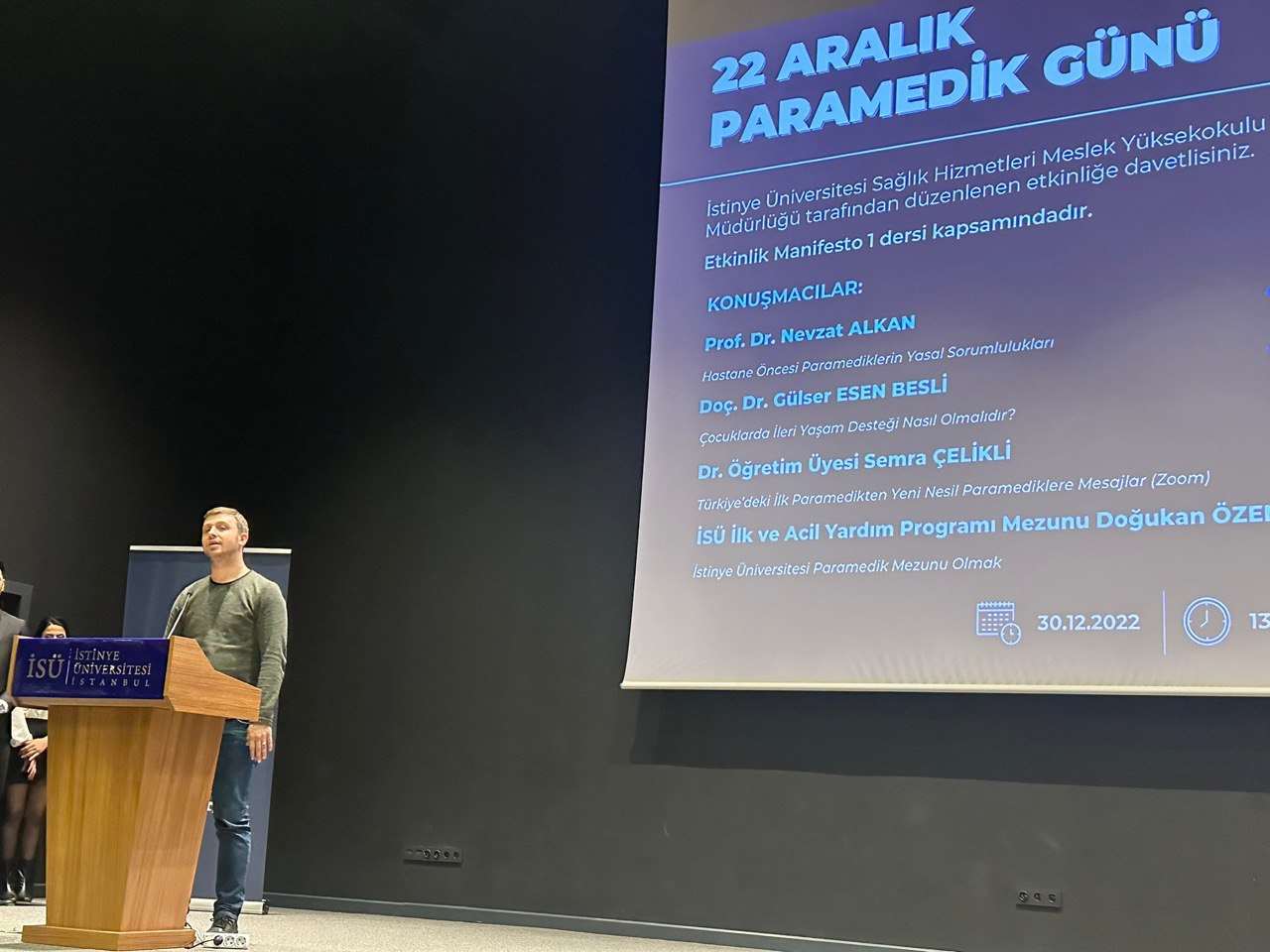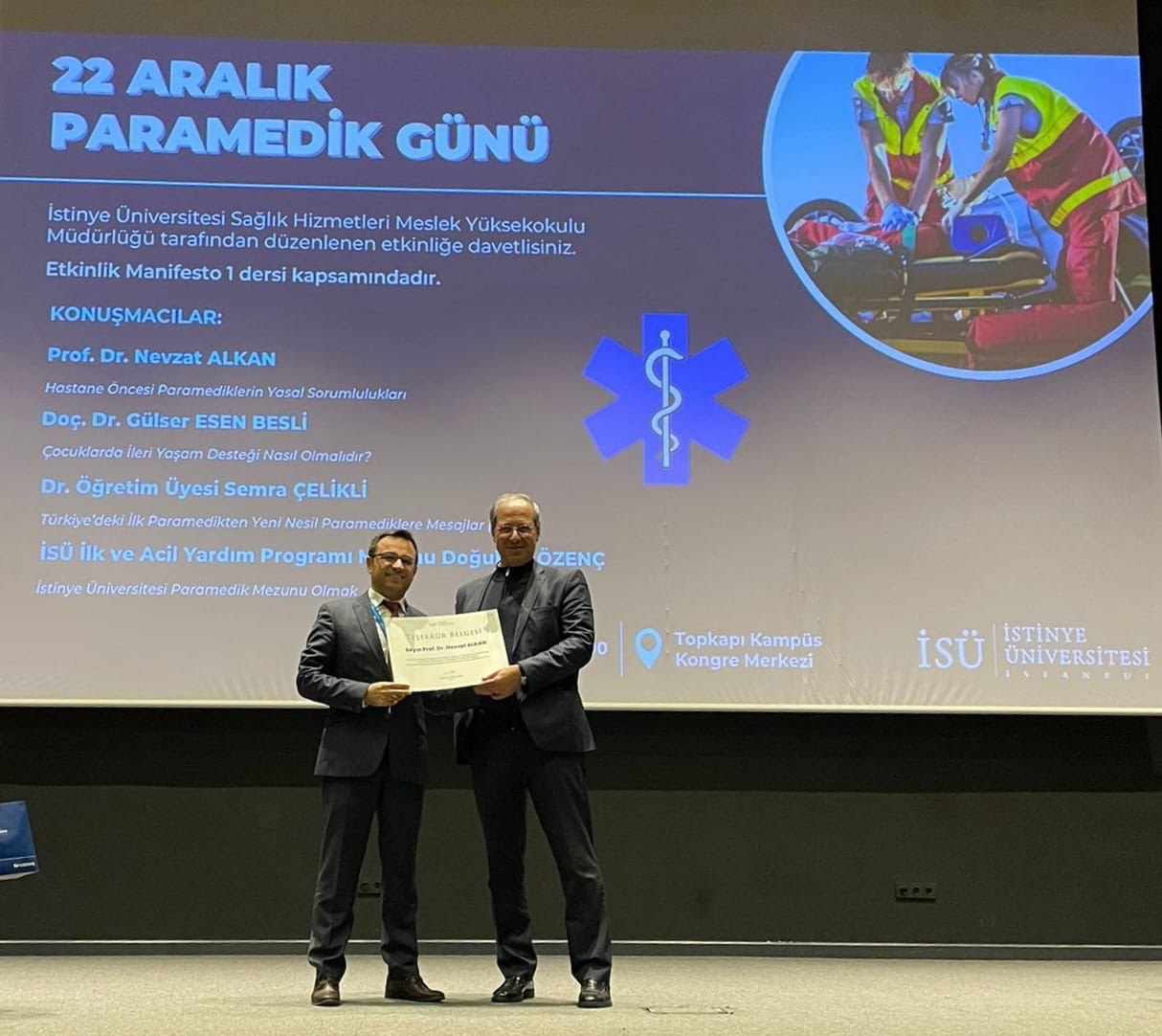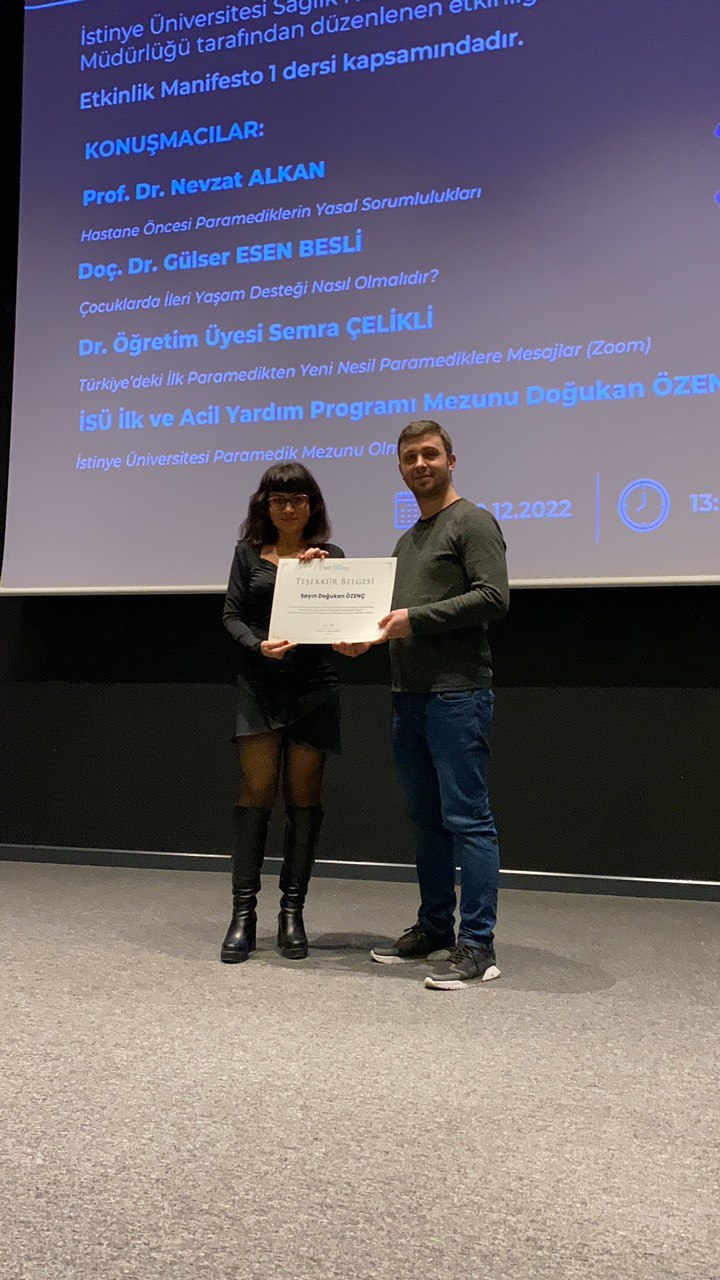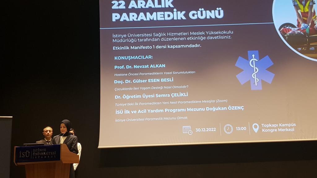 İstinye Üniversitesi Sağlık Hizmetleri Meslek Yüksekokulu İlk ve Acil Yardım Programı tarafından düzenlenen “22 Aralık Paramedik Günü” başlıklı Sempozyumu akademisyenlerimiz Öğr. Gör. Sevde Şanal, Öğr. Gör. Nihan Selin Mete, Öğr. Gör. Reyhan Öztürk ve Öğr. Gör. Ferhat Günerigök organizasyonları ile gerçekleştirilmiştir. Konuşmalarından ve katkılarından dolayı Prof. Dr. Nevzat Alkan, Doç. Dr. Gülser Esen Besli, Dr. Öğr. Üyesi Semra Çelikli ve mezun öğrencimiz Doğukan Özenç e teşekkür ederiz.