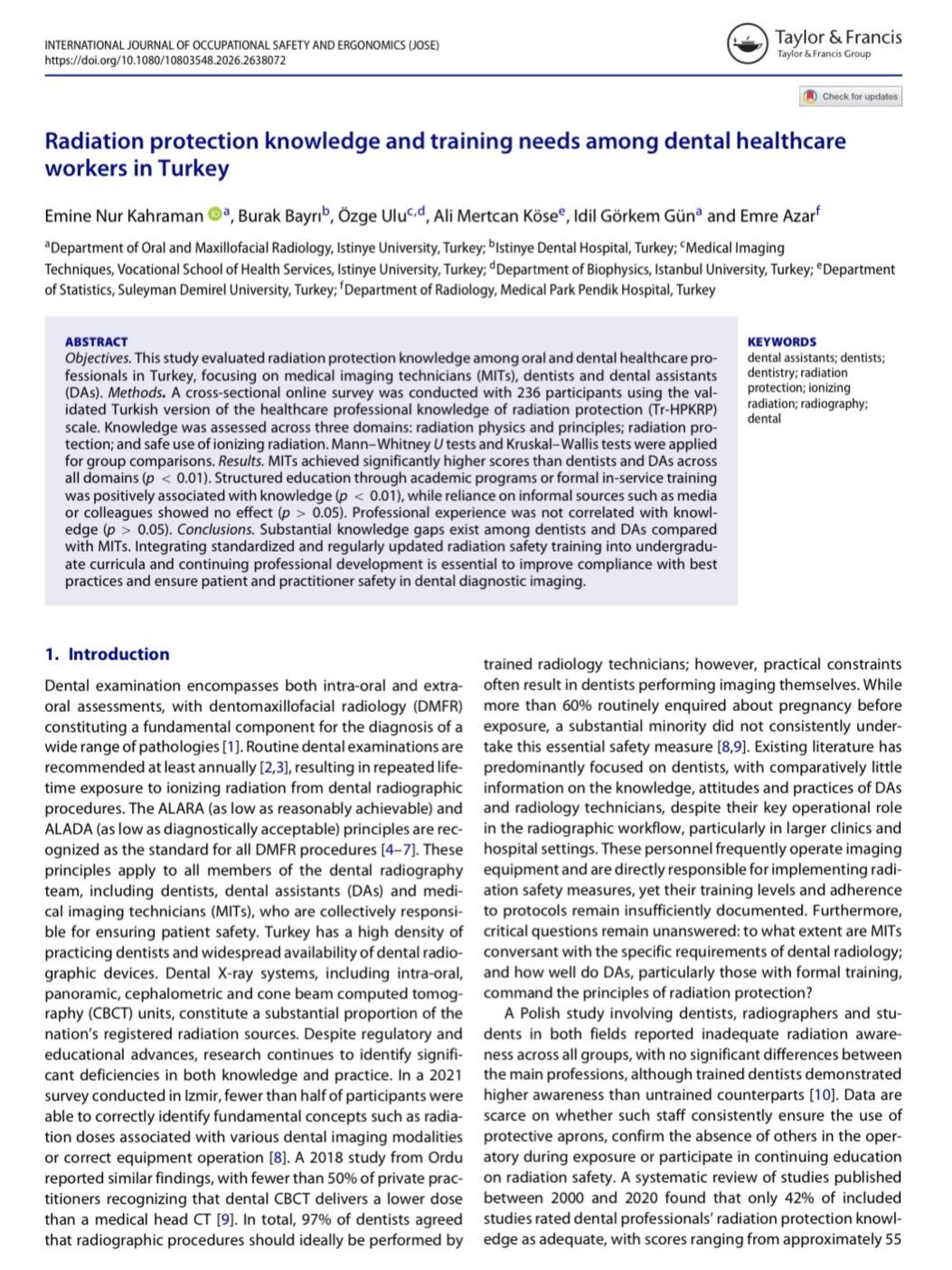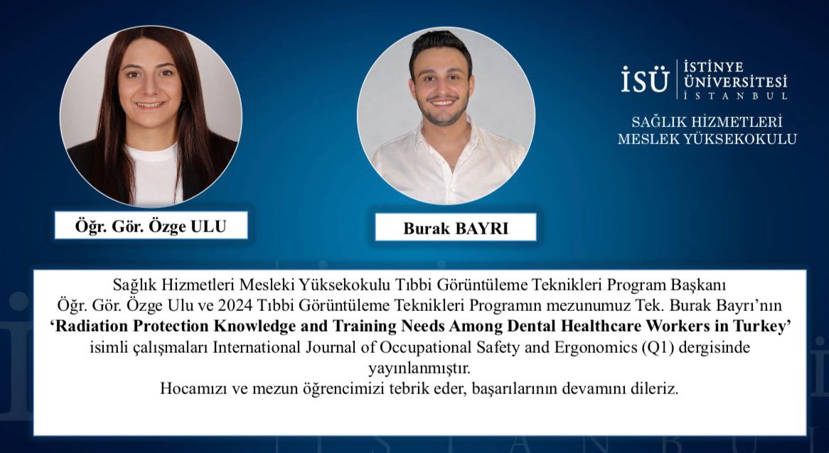 Sağlık Hizmetleri Mesleki Yüksekokulu Tıbbi Görüntüleme Teknikleri Program Başkanı Öğr. Gör. Özge Ulu ve 2024 Tıbbi Görüntüleme Teknikleri Programın mezunumuz Tek. Burak Bayrı’nın ‘Radiation Protection Knowledge and Training Needs Among Dental Healthcare Workers in Turkey’ isimli çalışmaları International Journal of Occupational Safety and Ergonomics (Q1) dergisinde yayınlanmıştır. Hocamızı ve mezun öğrencimizi tebrik eder, başarılarının devamını dileriz.