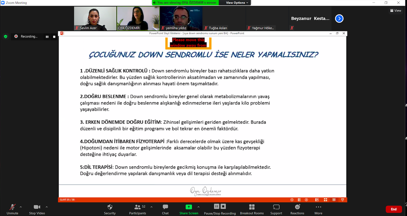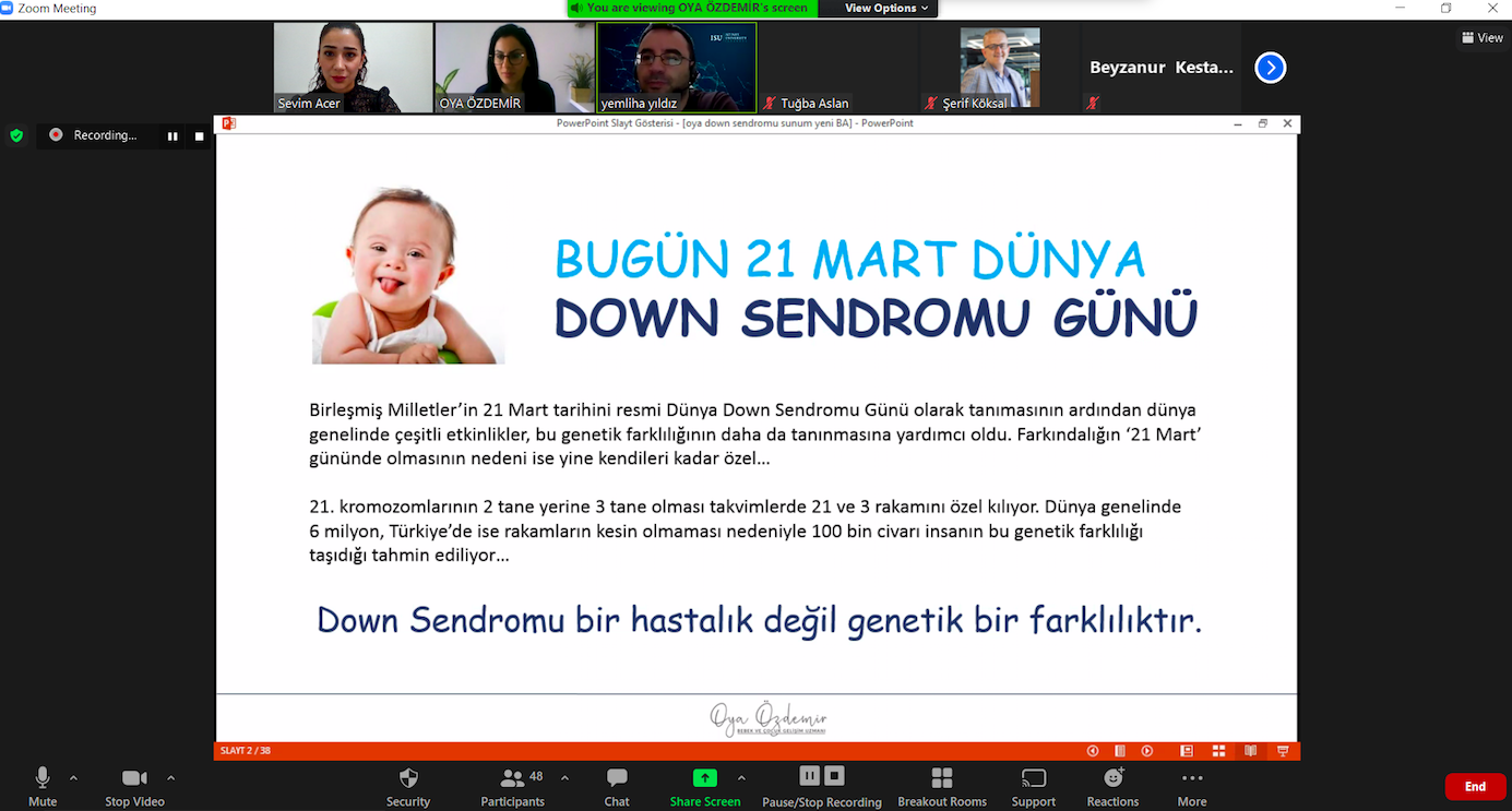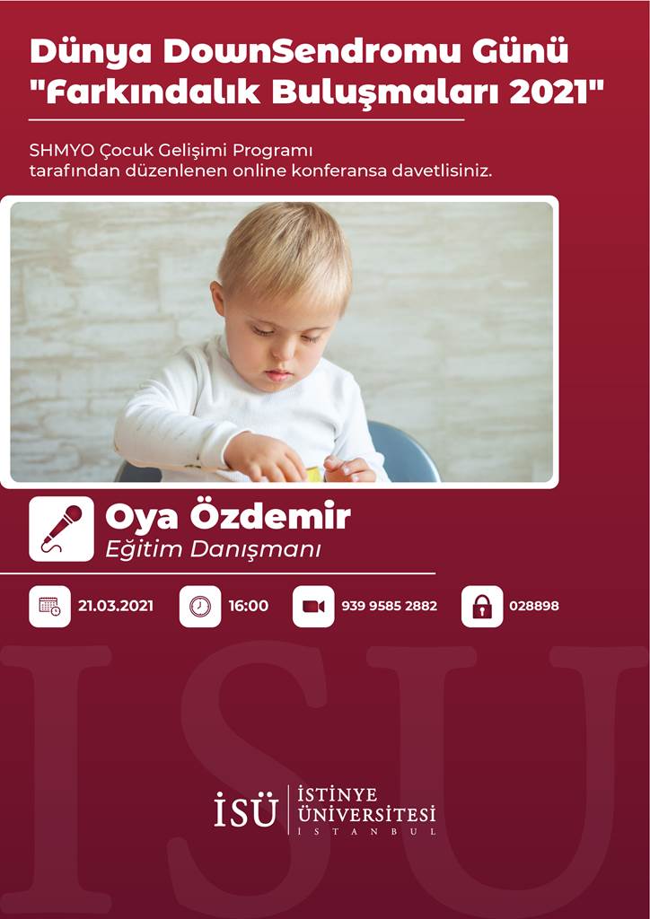 SHMYO Çocuk Gelişimi Programı tarafından bu yıl üçüncüsü düzenlenen Dünya Down Sendromu Günü ‘’Farkındalık Buluşmaları’’ semineri 21 Mart 2021’de online olarak gerçekleştirildi. Çocuk Gelişimi Program Başkanı Öğr. Gör. Sevim Acer’in günün anlam ve önemine değinen açılış konuşmasının ardından, uzun yıllardır Down Sendromlu bireylerle çalışan Eğitim Danışmanı Oya Özdemir tarafından Down Sendromlu bireylerin özellikleri, eğitimleri, toplum tarafından kabulleri vb. konularda farkındalık yaratmaya yönelik verdiği bilgiler dinleyicilerle paylaşıldı.