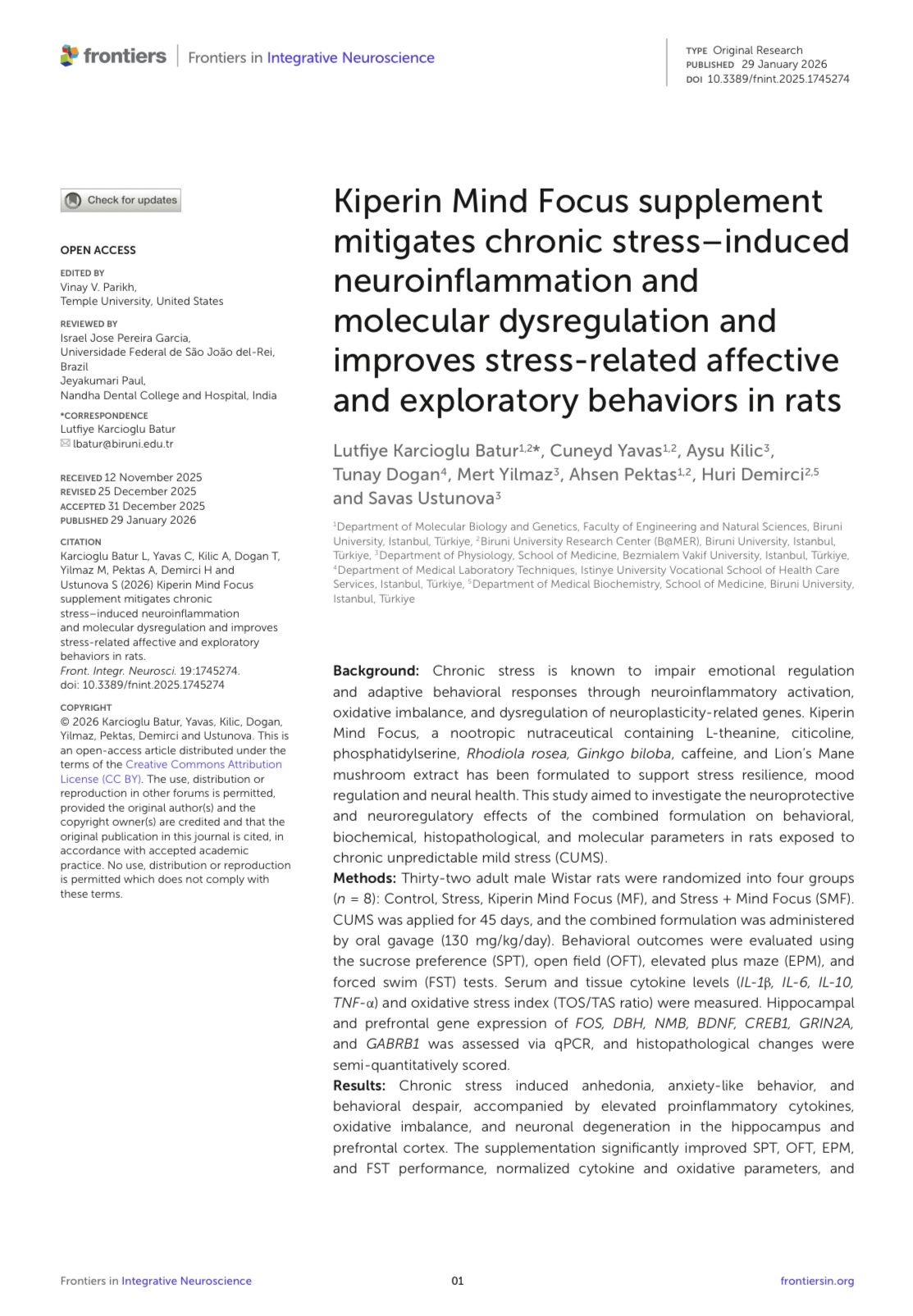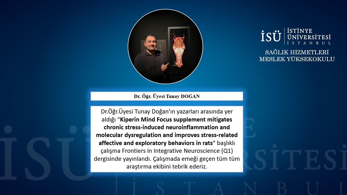 Dr.Öğr.Üyesi Tunay Doğan’ın yazarları arasında yer aldığı “Kiperin Mind Focus supplement mitigates chronic stress-induced neuroinflammation and molecular dysregulation and improves stress-related affective and exploratory behaviors in rats” başlıklı çalışma Frontiers in Integrative Neuroscience (Q1) dergisinde yayımlandı. Çalışmada emeği geçen tüm araştırma ekibini tebrik ederiz.