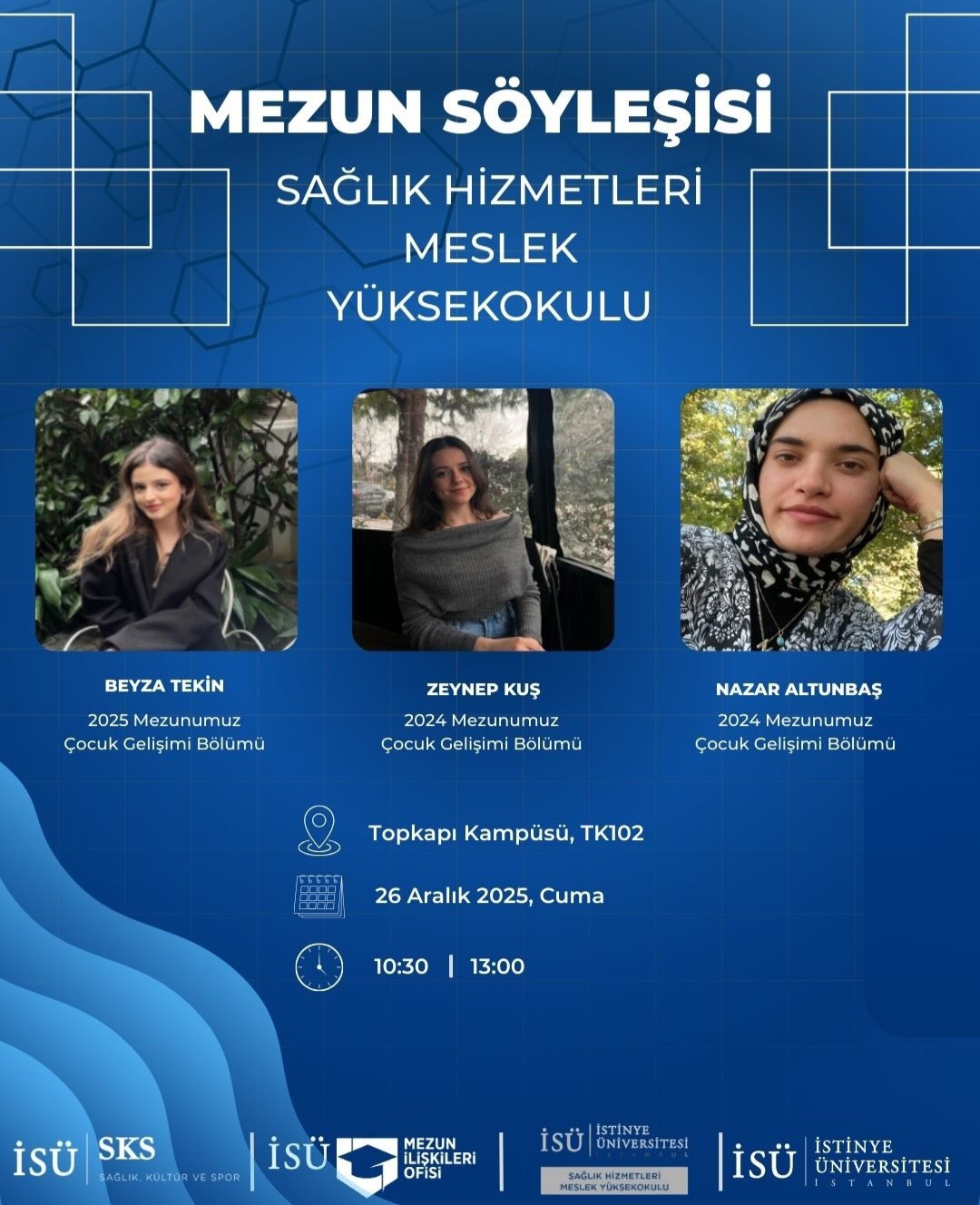 Çocuk Gelişimi Program Başkanımız Öğr. Gör. Duygu Arıcı Doğan, program hocamız Öğr. Gör. Sevil İmert ve Çocuk gelişimi programı öğrencilerimiz ile mezun söyleşisi gerçekleştirilmiştir. Söyleşiye 2024 yılı mezunlarımız sayın Zeynep Kuş ve Nazar Altunbaş katılım sağlamıştır. Mezun öğrencilerimize katkılarından dolayı teşekkür ederiz.