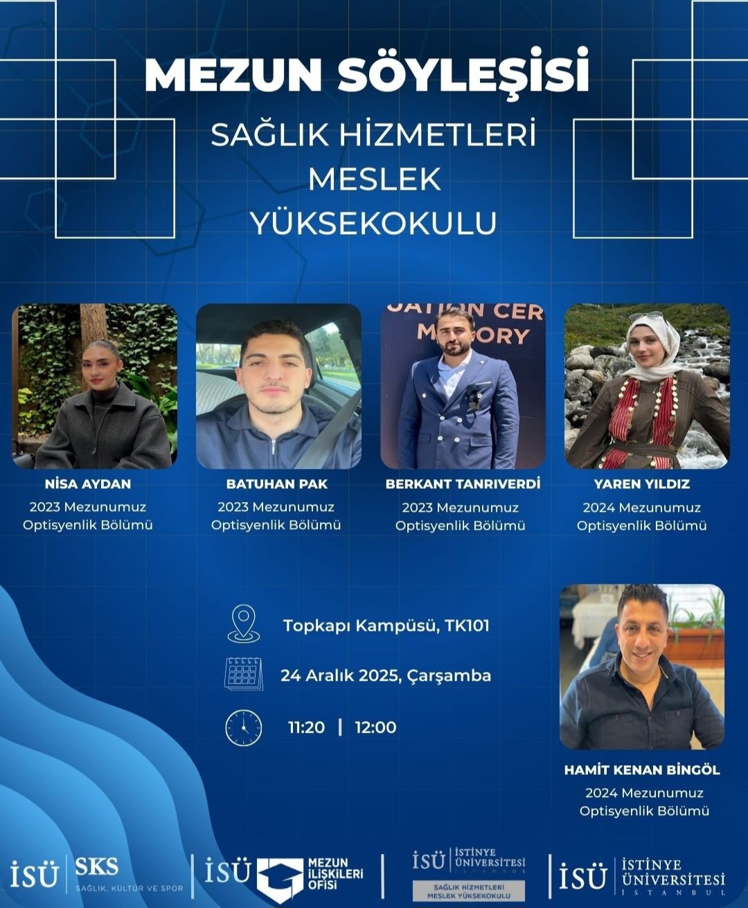 Optisyenlik Program Başkanı Dr. Öğr. Üyesi Hatice Gürel Özdemir, Dr. Öğr. Üyesi Emre Demir ve program öğrencilerinin katılımı ile Mezun Söyleşileri Programı gerçekleştirilmiştir. Programa 2023 yılı mezunlarımızdan Sayın Nisa Aydan, Batuhan Pak, Berkant Tanrıverdi ve 2024 yılı mezunlarımızdan Hamit Kenan Bingöl ve Yaren Yıldız katılım sağlamış; İstinye Üniversitesi Optisyenlik Programı öğrencilerine bilgi ve deneyimlerini aktarmıştır. Mezun öğrencilerimize değerli katkıları ve  paylaşımları için teşekkür eder, tüm öğrencilerimizin akademik başarılarının devamını dileriz.