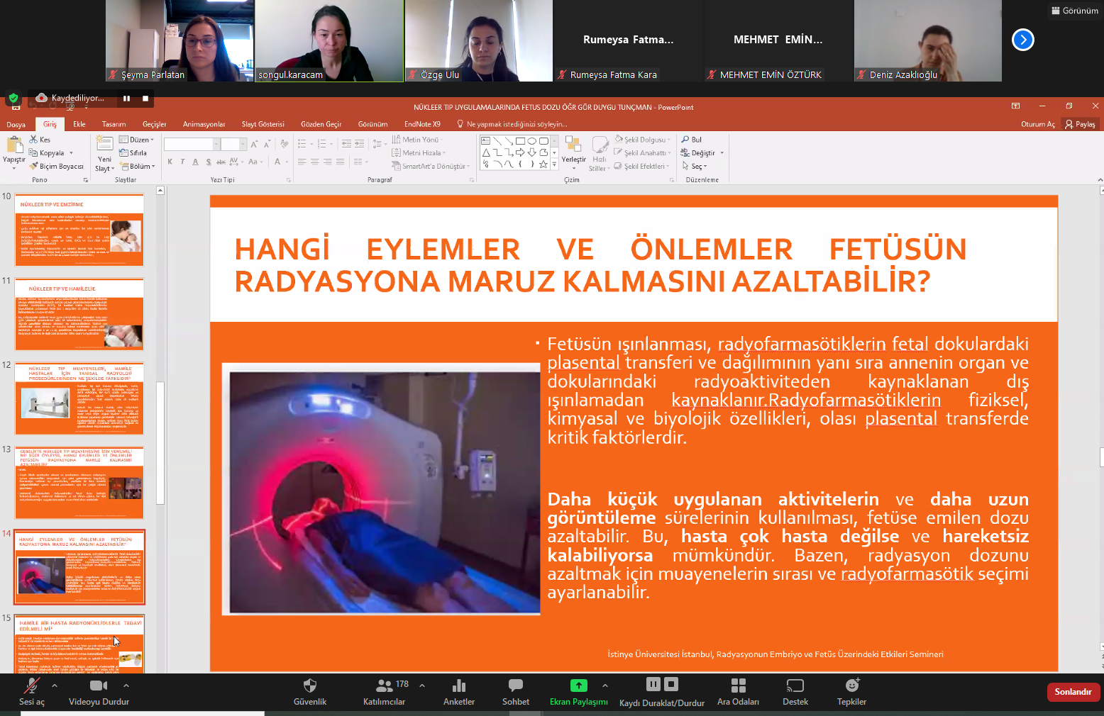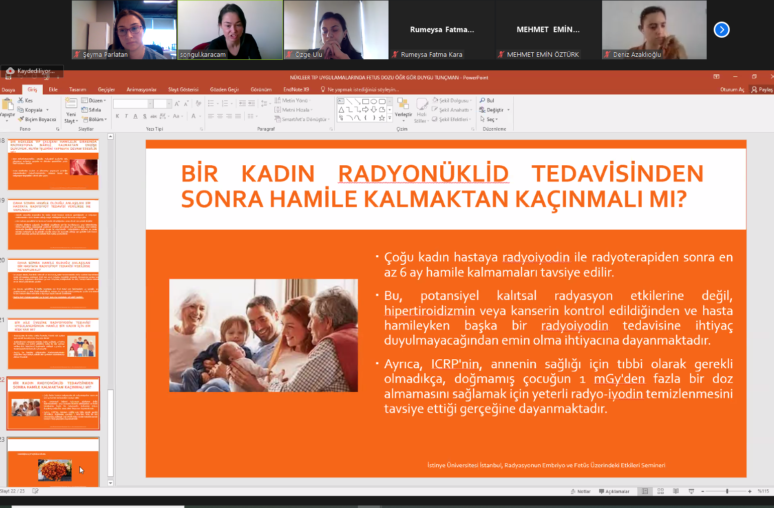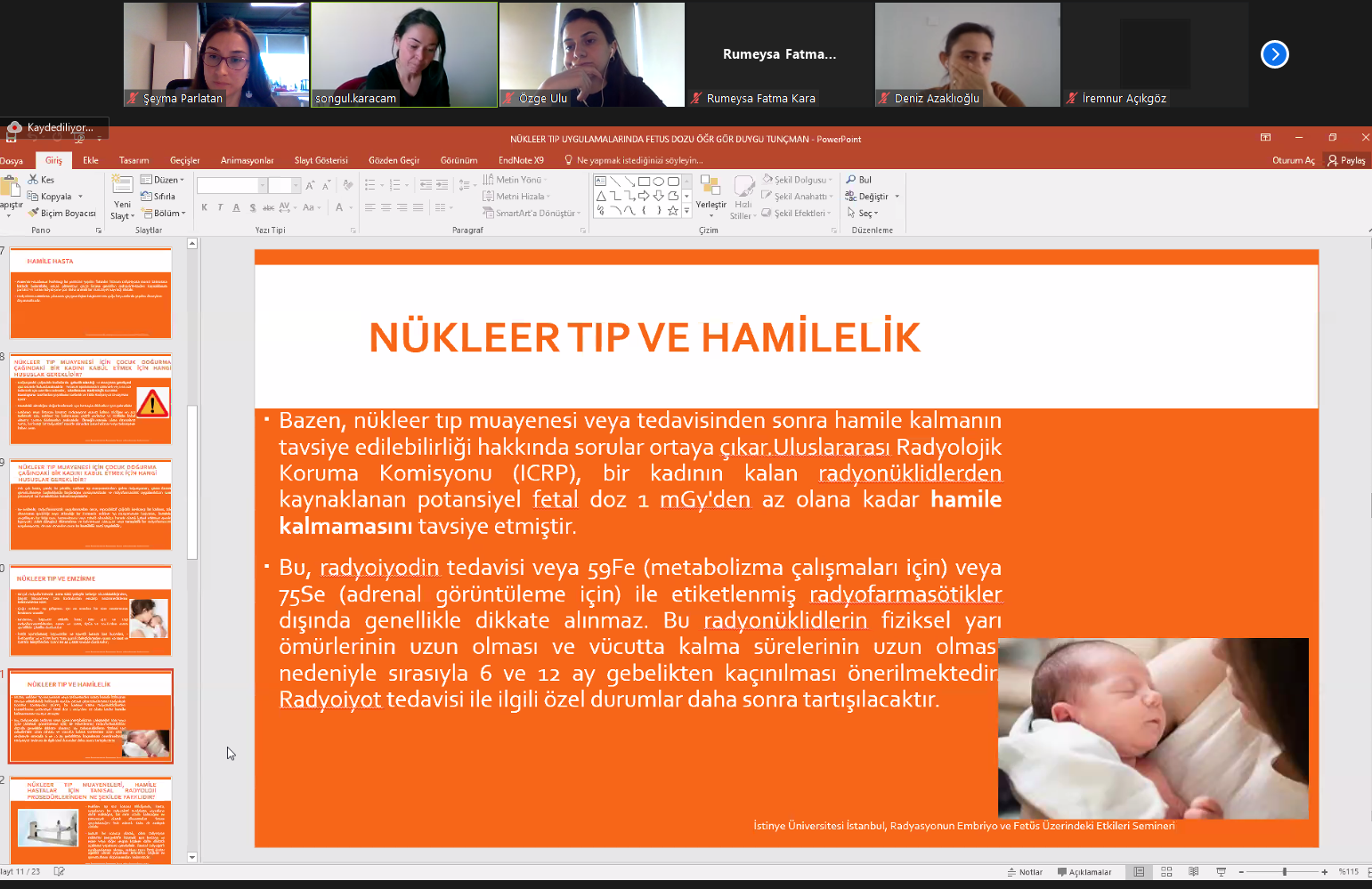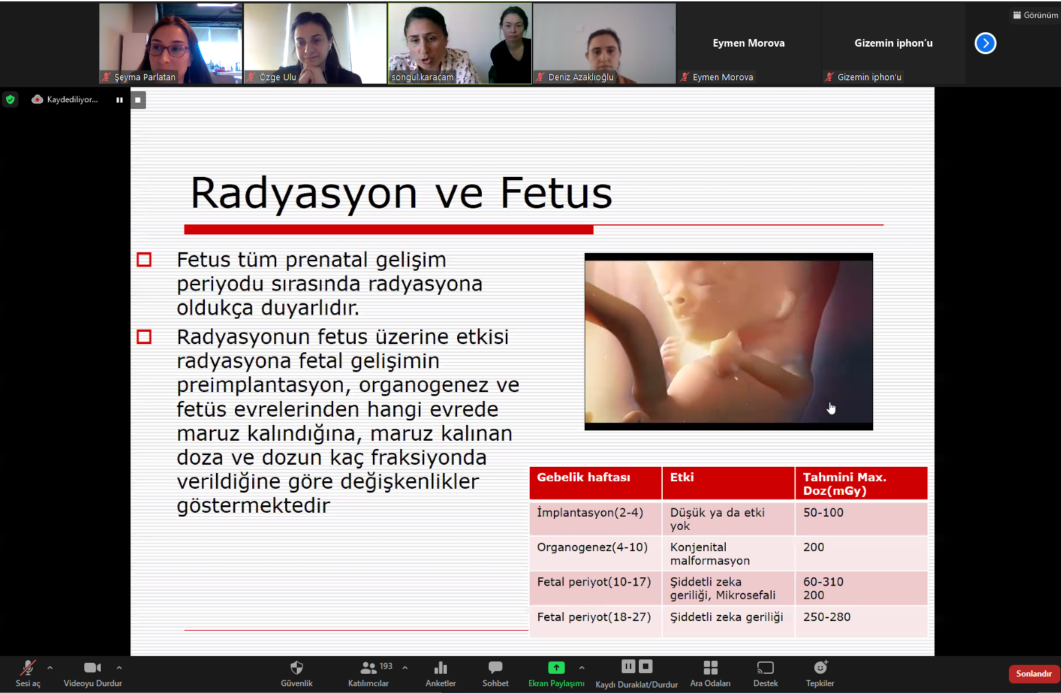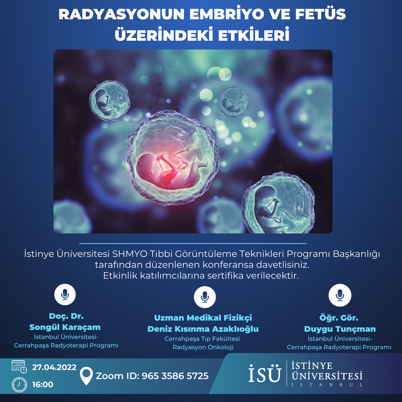 Tıbbi Görüntüleme Teknikleri programımız tarafından 27 Nisan 2022 tarihinde "Radyasyonun Embriyo ve Fetüs Üzerindeki Etkileri" başlıklı online konferans düzenlenmiştir. İstanbul Üniversitesi – Cerrahpaşa Sağlık Hizmetleri Meslek Yüksekokulu Radyoterapi programı ve İstanbul Üniversitesi – Cerrahpaşa Radyasyon Onkolojisi Anabilim Dalından değerli hocalarımızın katılımı ile tamamlanan etkinlik yaklaşık 200 katılımcı ile zoom üzerinden gerçekleşmiştir. Seminerde Sayın Doç. Dr. Songül Karaçam Radyoterapide Embiyo ve Fetüs Dozları, Sayın Öğr. Gör. Duygu Tunçman Nükleer Tıpta Embiyo ve Fetüs Dozları, Sayın Medikal Fizik Uzmanı Deniz Kısınma Azaklıoğlu Radyolojide Embiyo ve Fetüs Dozları konu başlıklı sunumlarını öğrencilerimizle paylaşmıştır. Katılım gösteren tüm öğrenci ve hocalarımıza teşekkür ederiz.