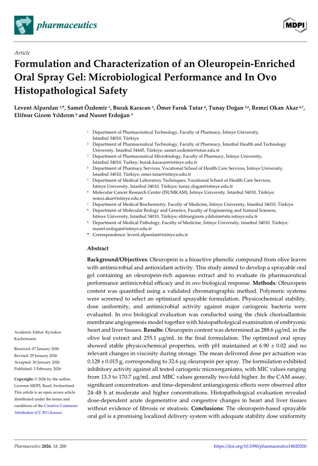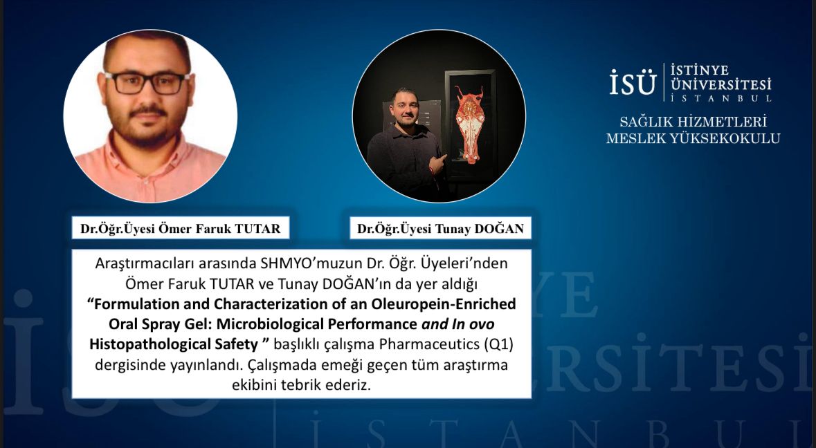 Araştırmacıları arasında SHMYO’muzun Dr. Öğr. Üyeleri’nden Ömer Faruk TUTAR ve Tunay DOĞAN’ın da yer aldığı “Formulation and Characterization of an Oleuropein-Enriched Oral Spray Gel: Microbiological Performance and In ovo Histopathological Safety ” başlıklı çalışma Pharmaceutics (Q1) dergisinde yayınlandı. Çalışmada emeği geçen tüm araştırma ekibini tebrik ederiz.