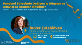 Pandemi Sürecinde Değişen İş Dünyası ve Adaylarda Aranılan Nitelikler konulu etkinliğimizde Türkiye İnsan Yönetimi Derneği (PERYÖN) Yönetim Kurulu Başkanı Buket Çelebiöven ile beraber bu konudaki sorulara cevap arayacağız.