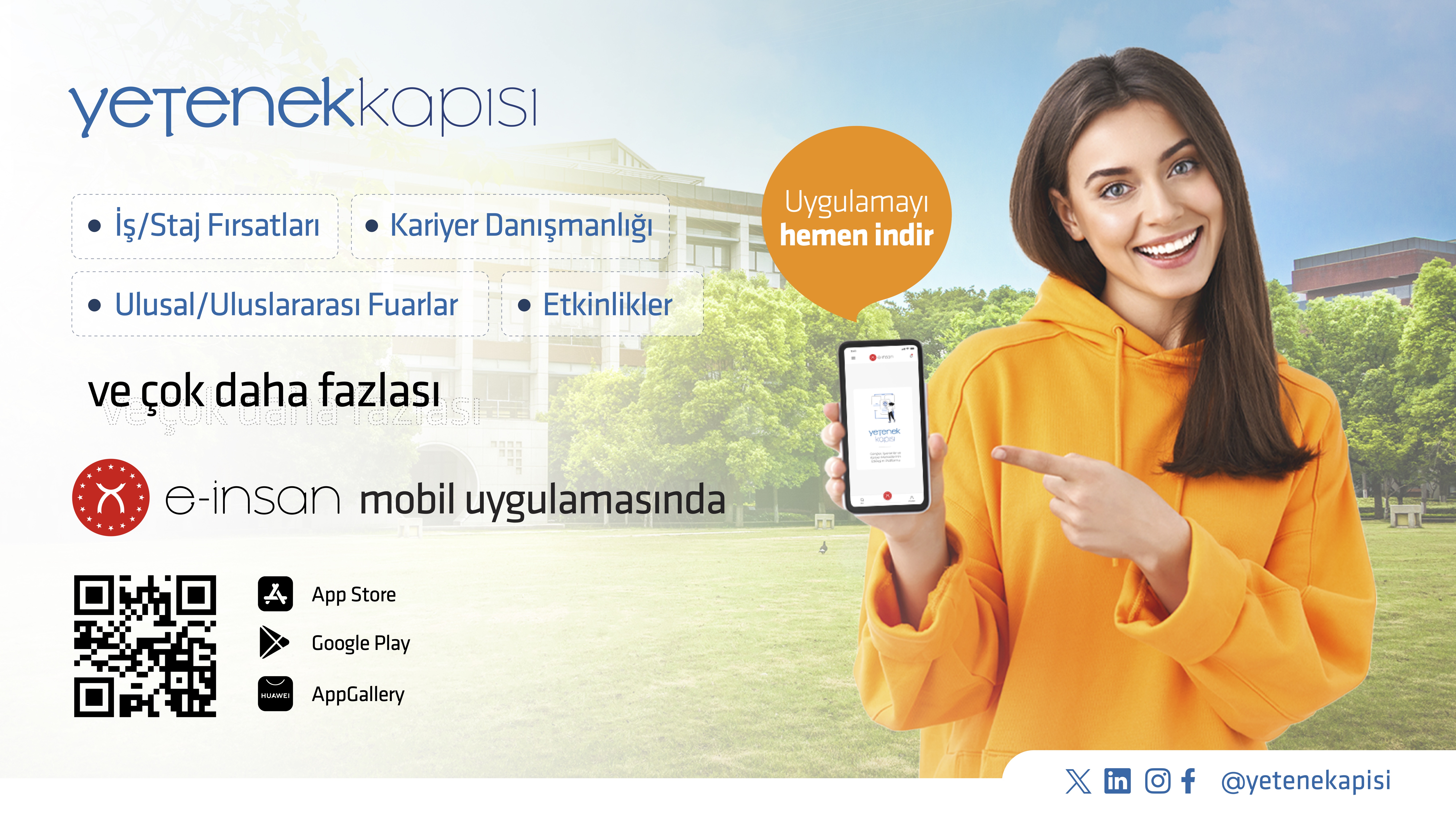 CBİKO Yetenek Kazanımı ve Organizasyon Dairesi tarafından geliştirilen; Ulusal Staj Programı, Kariyer Kapısı, Yetenek Kapısı ve YTNK TV gibi eğitim ve iş hayatına dair üretilen kariyer hizmetlerinin bütünleşik olarak sunulduğu e-insan platformunda  İş/Staj ilanları, kariyer danışmanlığı, kariyer fuarları, etkinlikler ve çok daha fazlasına tek bir tık ile ulaşabilirsiniz.