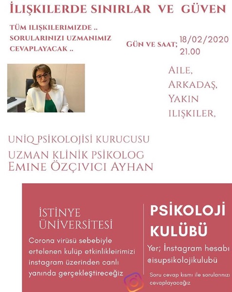 İstinye Üniversitesi Psikoloji Kulübü 18 Mart Çarşamba Günü saat 21.00’da Uzman Klinik Psıkolog Emine Özçıvıcı Ayhan ile Aile, arkadaş, yakın ilişkiler ile ilgili konulara değindi