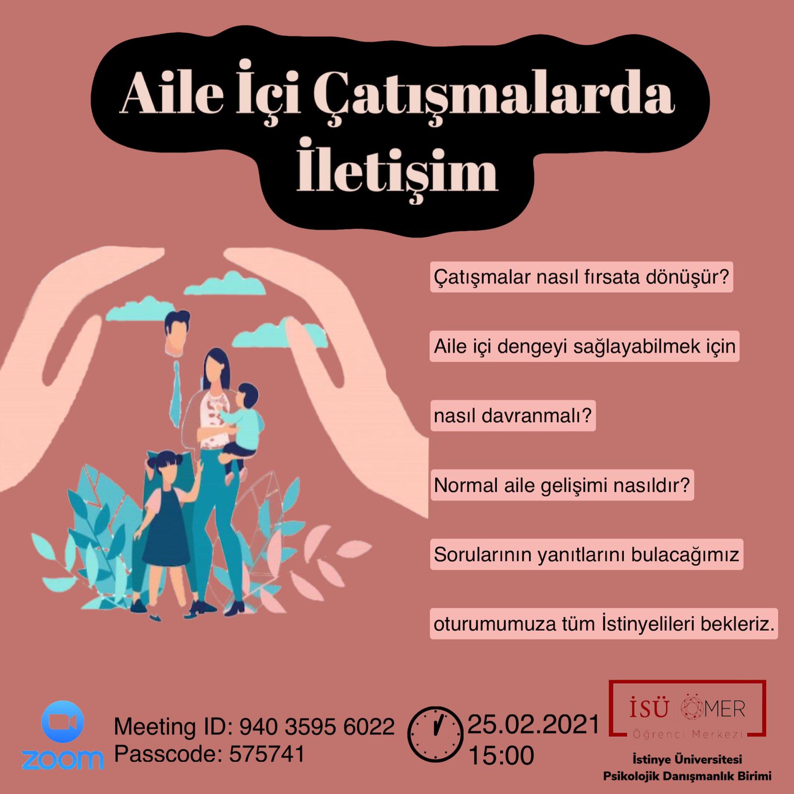 Çatışmalar nasıl fırsata dönüşür? Aile içi dengeyi sağlayabilmek için nasıl davranmalı? Normal aile gelişimi nasıldır? soruları üzerinden gerçekleştirdiğimiz Aile İçi Çatışmalarda İletişim oturumumuz gerçekleştirildi.