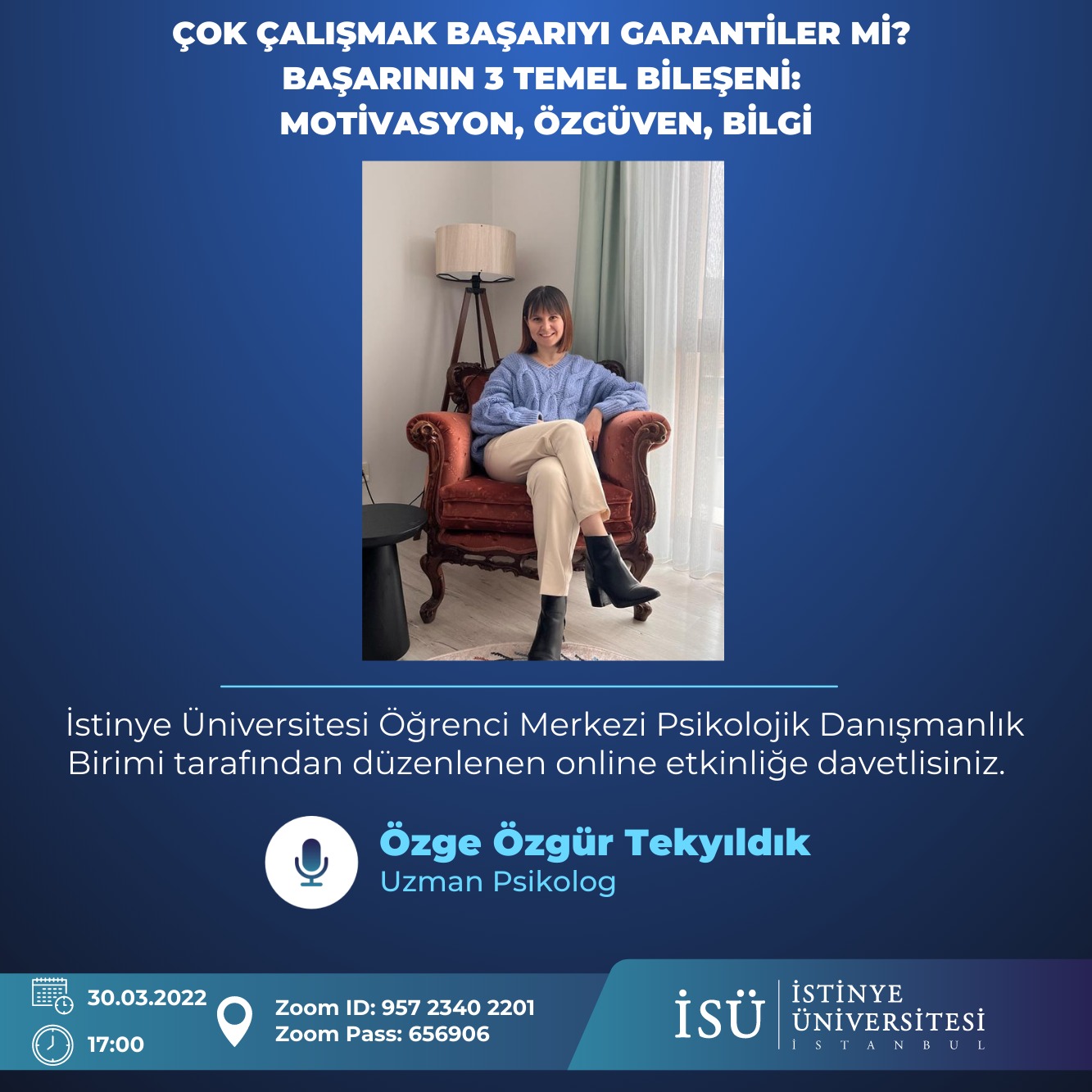 Başarıyı hedeflerken karşımıza çıkan ve bizi çokça mesgul eden bu soruların cevaplarını bütüncül olarak 3 farklı temadan değerlendireceğimiz etkinlikte Uzman Psikolog Özge Özgür TEKYILDIK merak edilen soruları cevapladı.